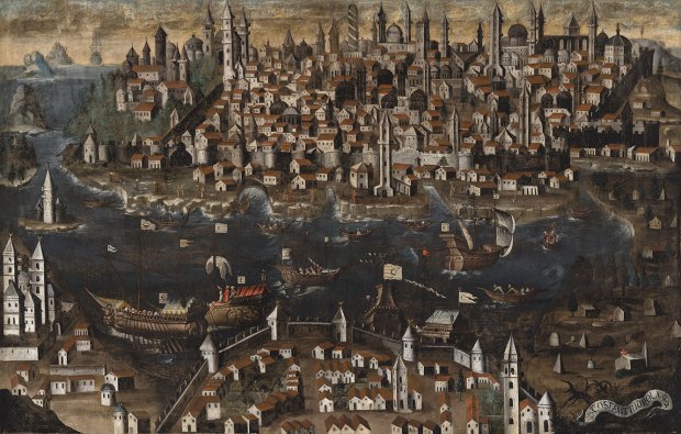 The Leander Tower stands on its islet in the Bosphorus, and the somewhat sparsely inhabited walled quarter of Pera in the foreground overlooks the entrance to the Golden Horn, where galleasses reminiscent of the often celebrated Battle Lepanto of 1571 can be seen. On the far right we can glimpse the Byzantine Aqueduct of Valens (below).