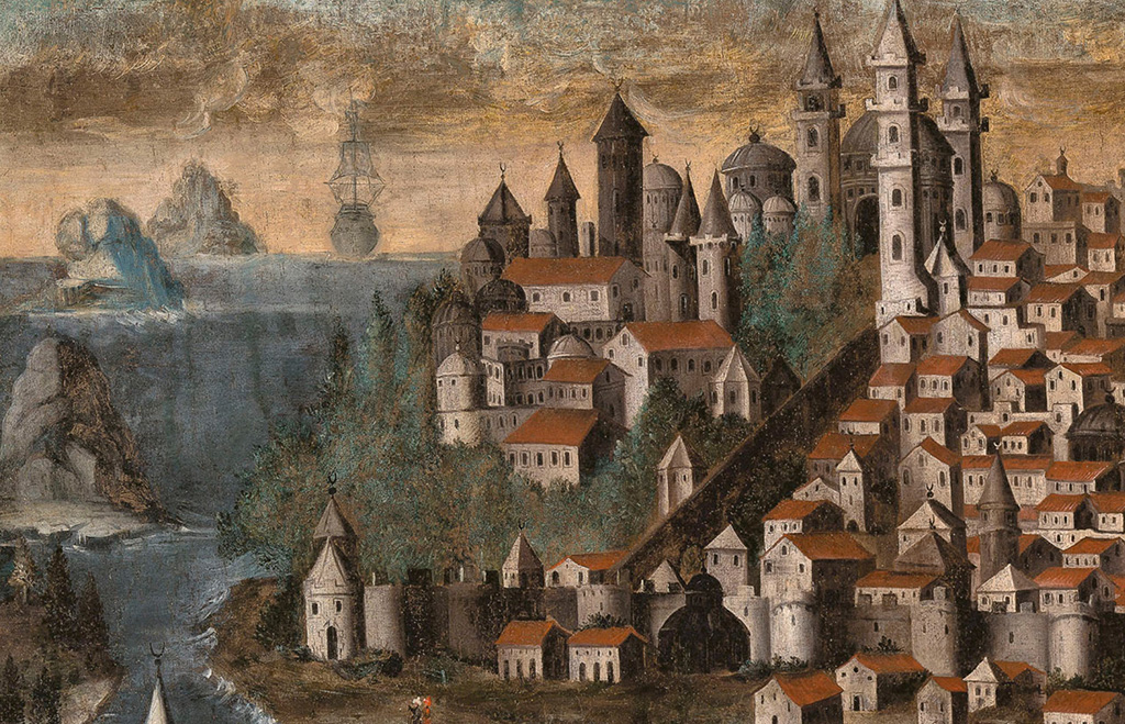All the familiar Istanbul landmarks are there, scattered across the peninsula, but mingled with fortified towers plucked from the hill towns of Tuscany. On the far left are the gardens of Topkapı Palace (above), and the domes of Ayasofya. A mysterious galleon can be seen on the horizon.