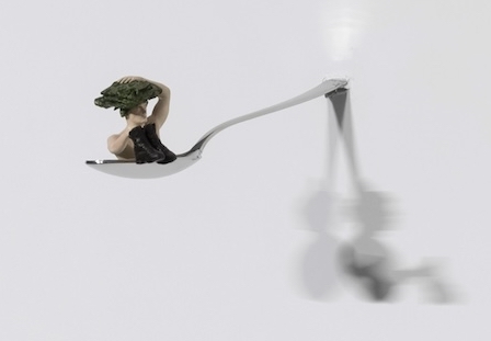 Tekin explores this concept in Upside Down (2024), an installation featuring 12 small sculptures (see detail above). Each depicts the upper body of a man emerging from a spoon. In his right hand he holds a pair of boot-like shoes, while his left hand rests atop his head, clutching folded clothes. These figures are arranged in a repetitive pattern along the wall, collectively forming the installation. Each figure symbolises an individual crossing a river. The act of crossing the water requires them to physically shed their clothing and masks, stripping away the identities they wear in daily life.