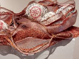 Positioned on the right wall of the entrance, Untitled (2023–2024) serves as a compelling embodiment of Öz’s vision, blending traditional techniques with contemporary innovation to reimagine heritage in a fresh and dynamic way. The artwork features layered, rectangular strips of woven textile, dyed in rich shades of red, crimson and burgundy. Repetitive yet varied black floral and leaf motifs, applied through block printing, decorate the surface. The intersecting layers form a grid-like structure, with lighter, uncoloured sections adding depth and contrast. Uneven edges, with frayed or extended strips, imbue the piece with a sense of movement and raw imperfection. This interplay of traditional motifs and modern, deconstructed aesthetics creates a visually dynamic and tactile experience that defines Öz’s unique approach.