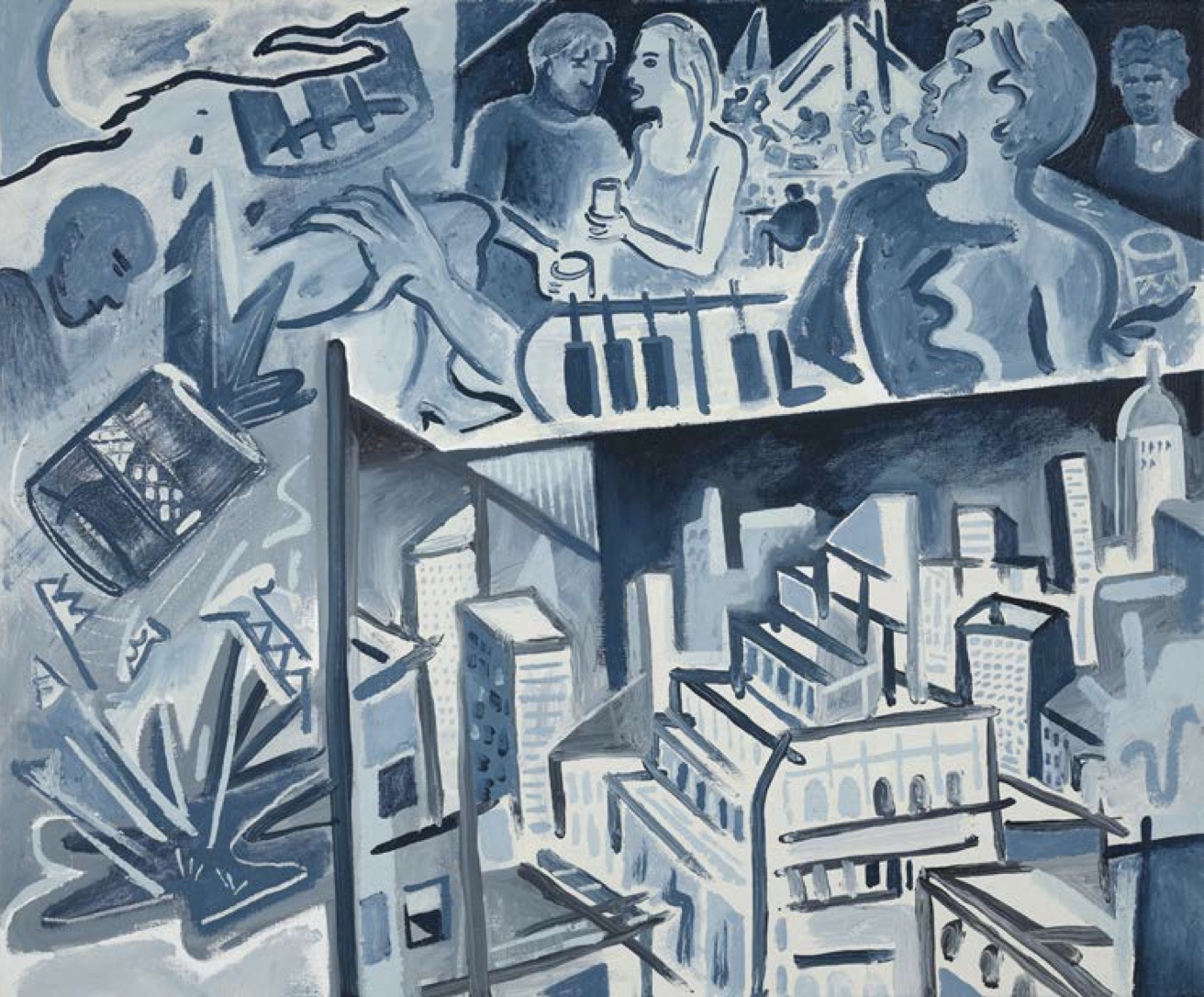 One of the exhibition’s standout pieces, Smalls (2024), pictured above, is a large oil painting on canvas nearly two metres by three metres, capturing the chaotic vibrancy of a city’s nightlife, reminiscent of New York. The lower half of the painting is dominated by towering high-rise buildings, anchoring the scene in a bustling urban landscape. At the centre, a close-up of hands playing the piano draws the viewer’s attention, while to the left a man at a bar holding a beer mirrors the viewer’s immersion in the music. In the far top left corner, a trumpet player intensifies the scene's energetic atmosphere. The upper right corner reveals a sequence of four scenes, subtly unfolding in a light green palette that adds an air of mystery.