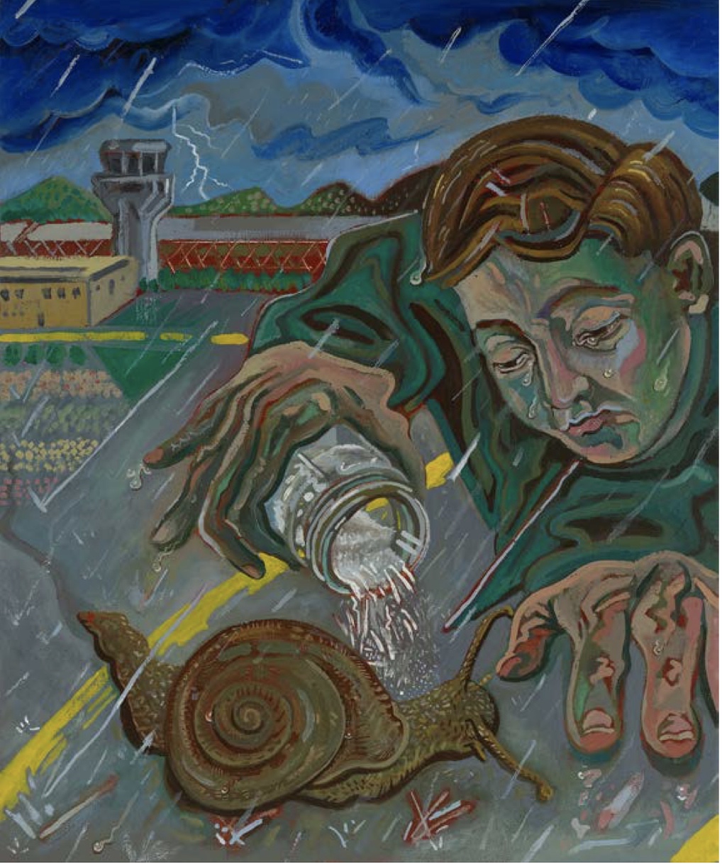 Amid the more lively pieces The Meanders (2024) offers a striking contrast, portraying a rainy scene with a close-up of a sullen-faced boy salting a slug, and evoking a sense of melancholy.