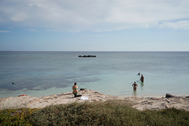 The bathers in a decidedly desultory beach beside a becalmed sea in Favignana, Sicily are anonymous, motionless, structural elements in a composition of stillness, and not there to evoke questions about their back story.