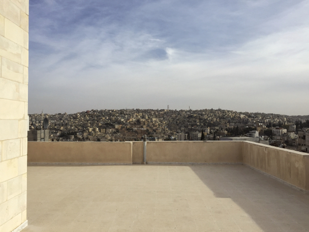 A crowded skyline in Jordan is turned into a lonely still life, framed by the geometry of the large empty terrace and capped by a mysterious skyscape of blue and white with the focal point being a bit of mist that looks like someone has stuck their thumb through the clouds.