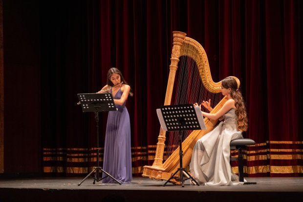 The next item featured double-bass player Deniz Akgün and (once again) harpist Zeynep Duru Güleç in the Tarantella by Giovanni Bottesini (1821–89) and the Méditation, Opus 18, by Gabriel Verdalle (1847-1918). Bottesini, an Italian well known in his time as a virtuoso double-bass player (he was dubbed “the Paganini of the Double Bass"), was also a composer and conductor who was chosen by Verdi to conduct the first performance of this latter’s opera Aida in Cairo in 1871. The Frenchman Gabriel Verdalle, meanwhile, spent most of his career as chief harpist of the Paris Opera. The double bass has the – well justified – reputation of being an unwieldy instrument, but Ms Akgün demonstrated remarkable control over it in Bottesini’s Tarantella, executing the pyrotechnics in the upper register demanded of the soloist with seeming ease. In Verdalle’s Méditation, Ms Güleç played with great assurance and panache. Here, just as in the Rota Sonata, her graceful arm movements were a pleasure to watch.