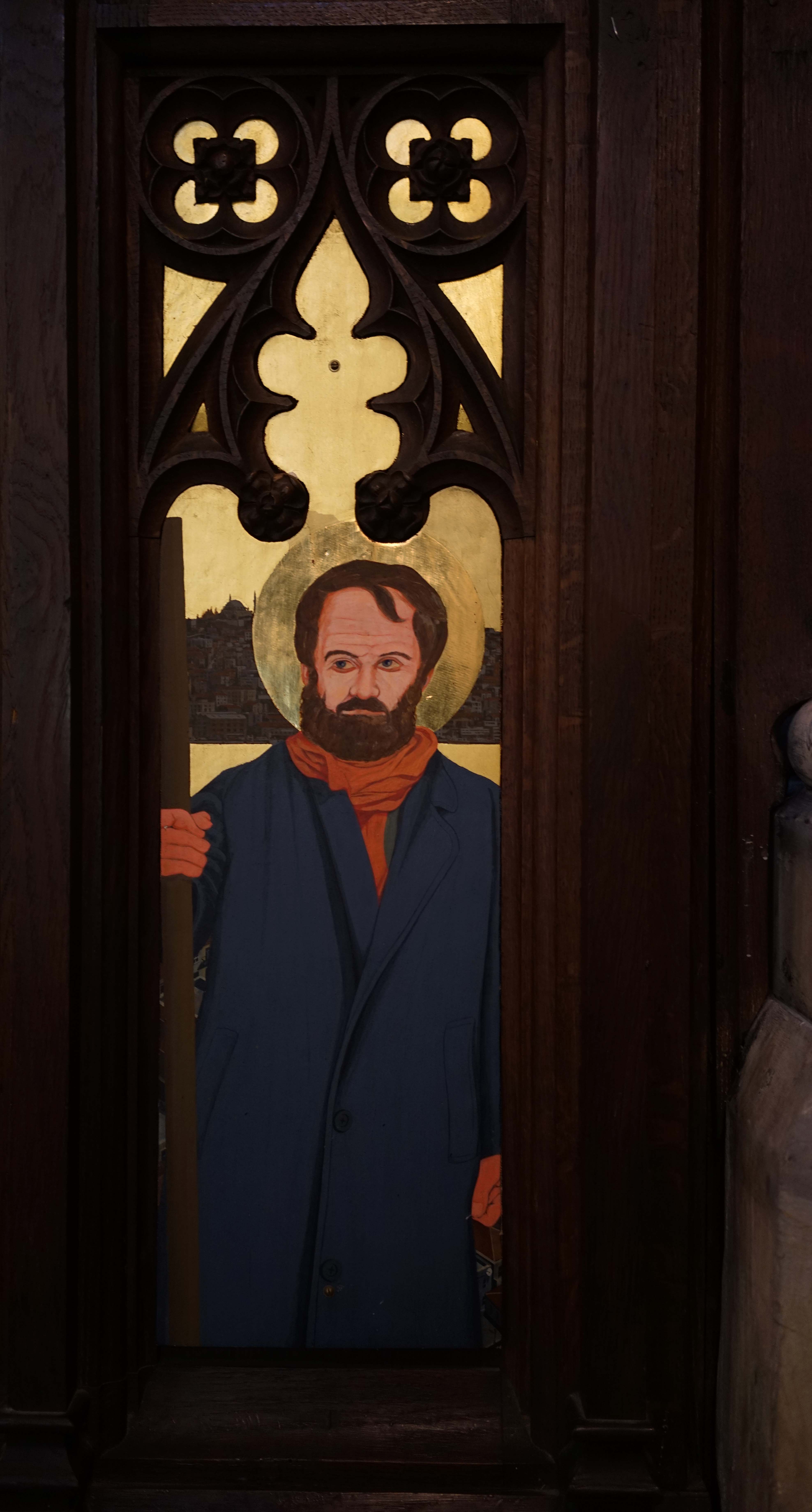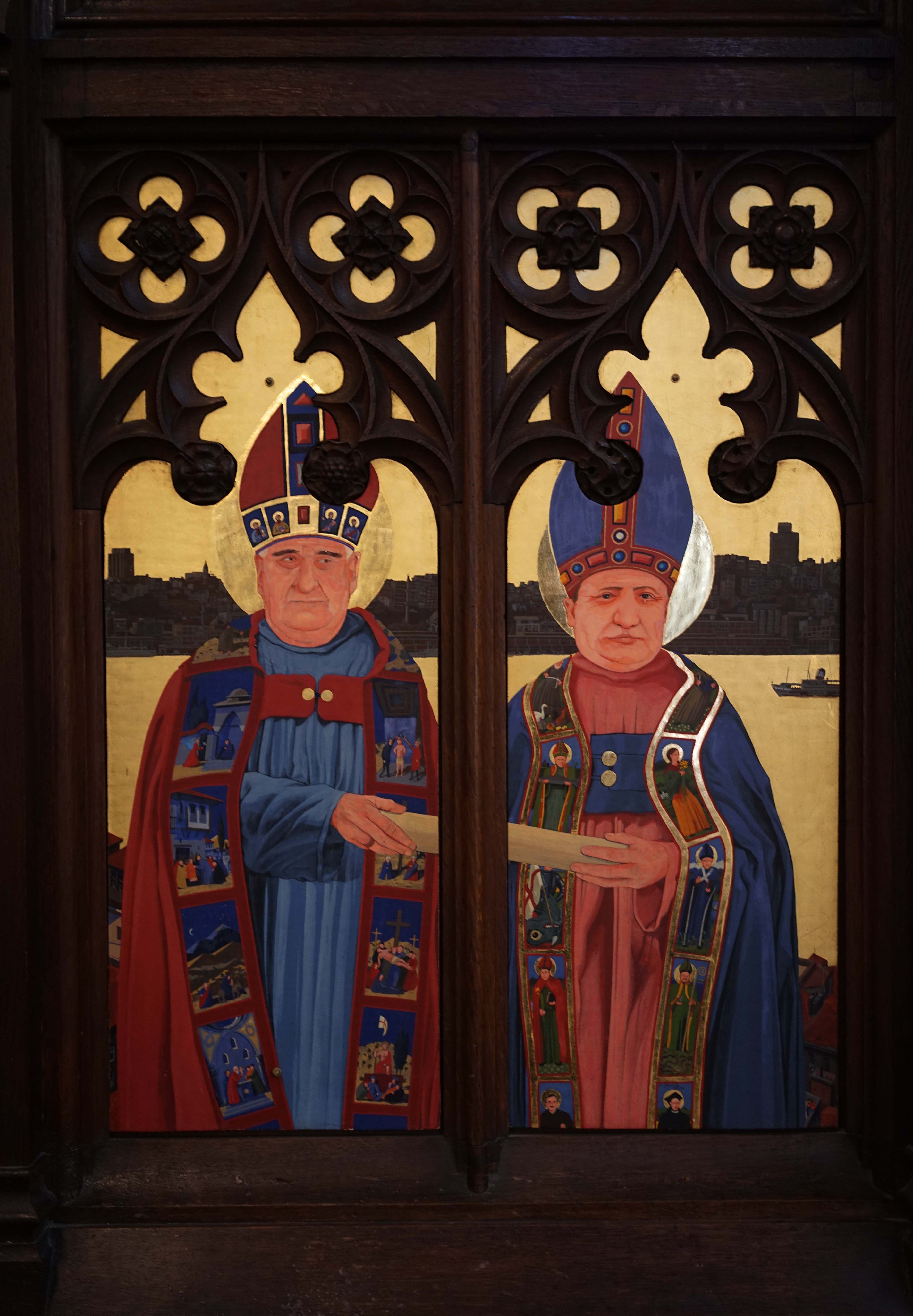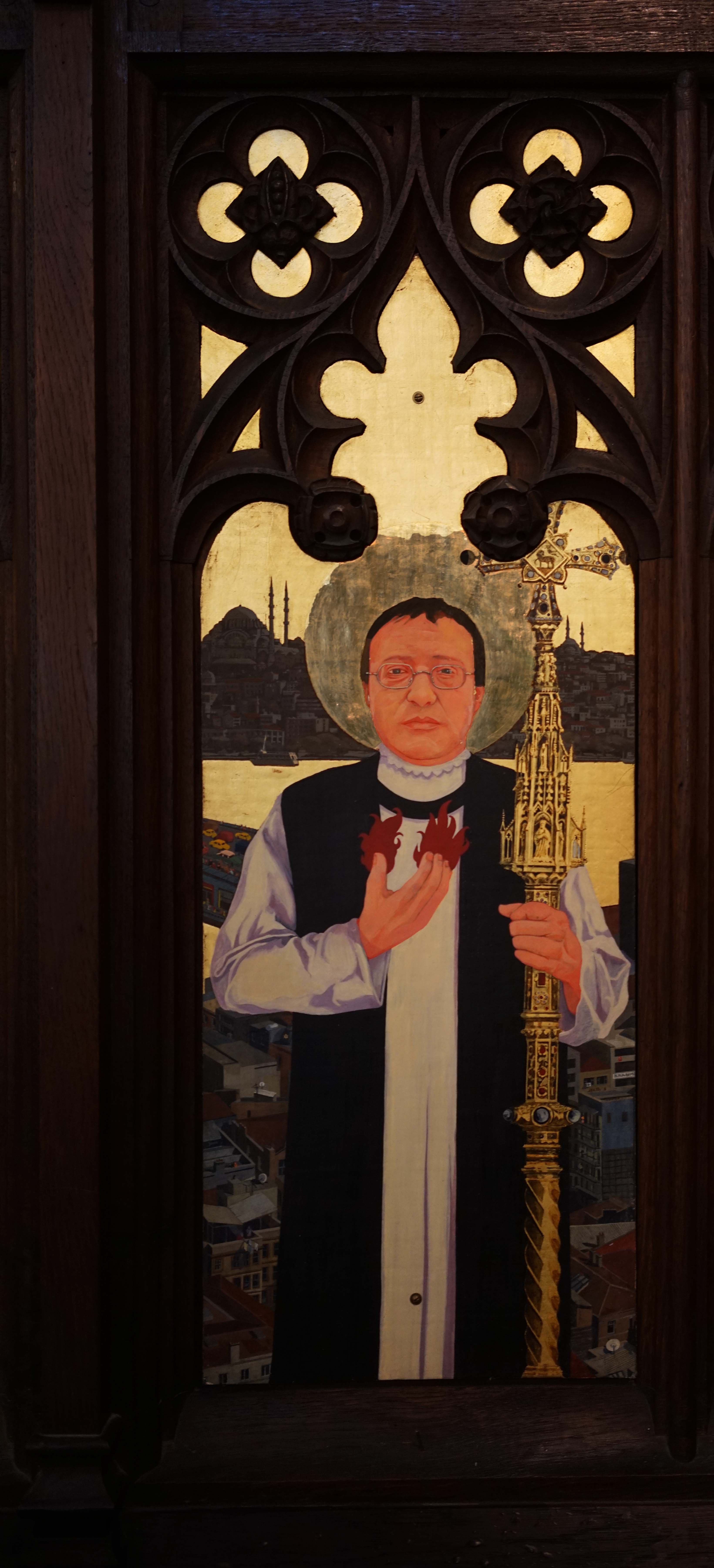On Archbishop Ramsey’s robes you can see scenes of the Gospel such as the Nativity, the Crucifixion and the Resurrection. Pope John XXIII’s robe shows the saints of the British Isles: Saints George, Andrew, David (with his daffodil) and Patrick, patron saint of Ireland (who looks a bit like me, Ian, when it was painted). St Mungo is also there. In the background you have the heavenly city of Istanbul, in fact a view of Beyoğlu. The Galata Tower is on left, and near it is Christ Church and Saint Antoine’s Church, The Marmara Hotel in Taksim is on the far right.