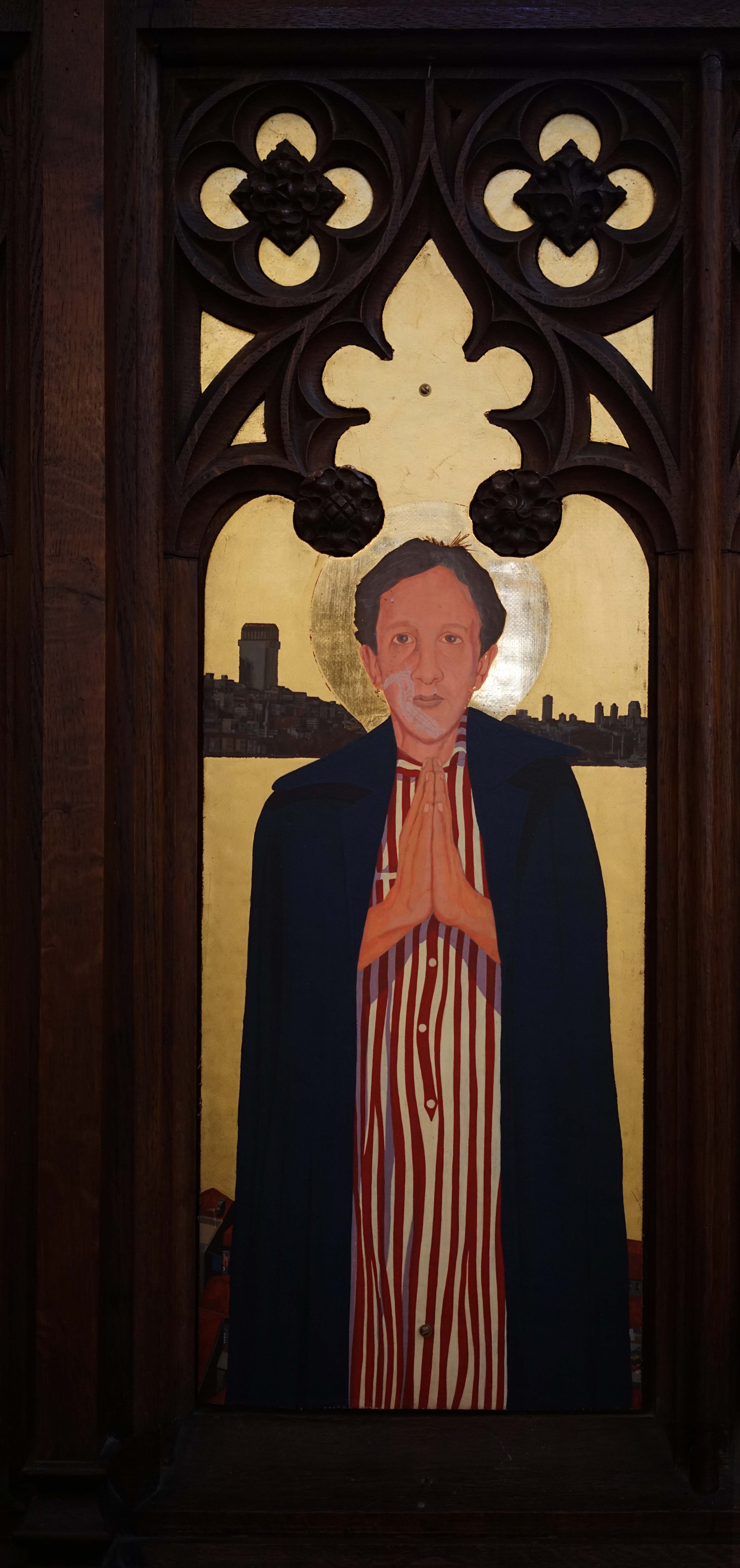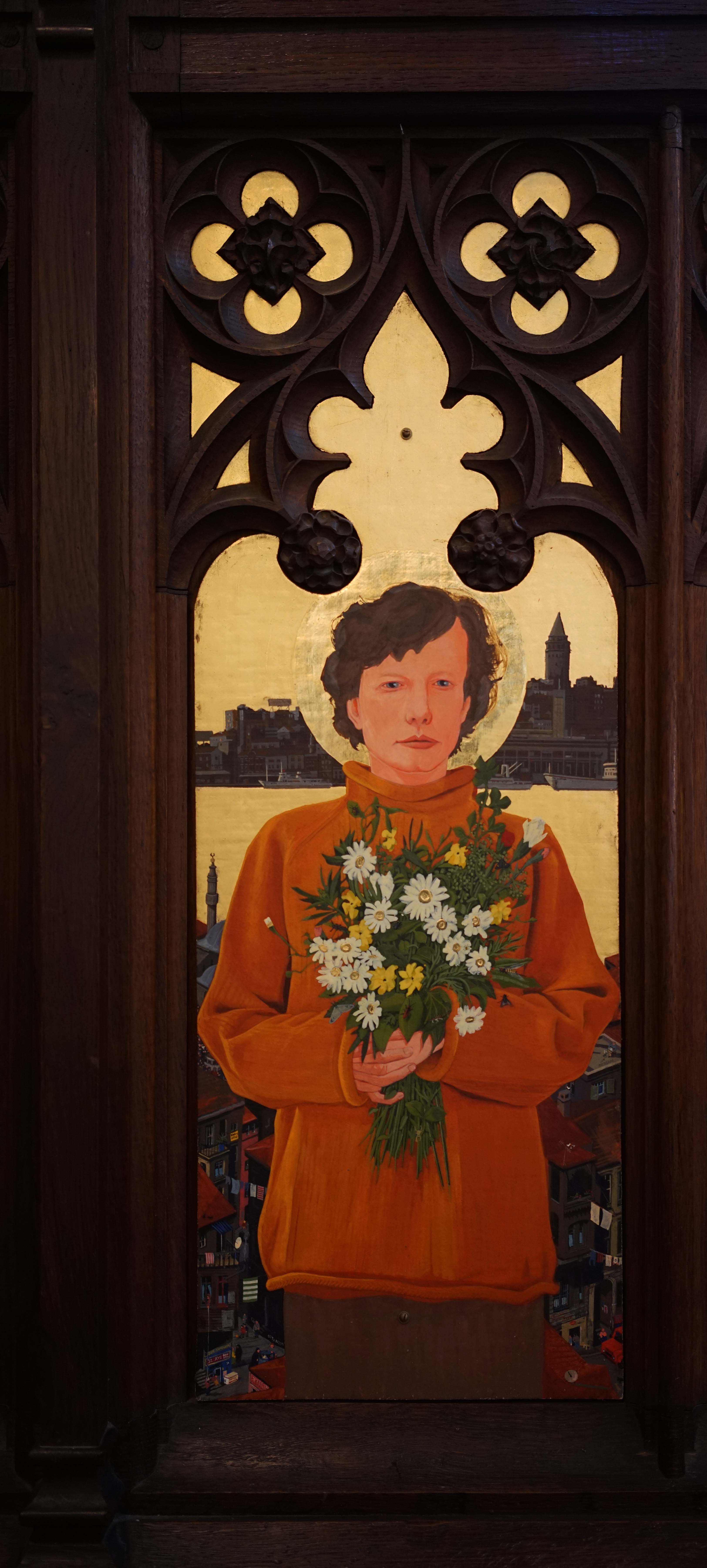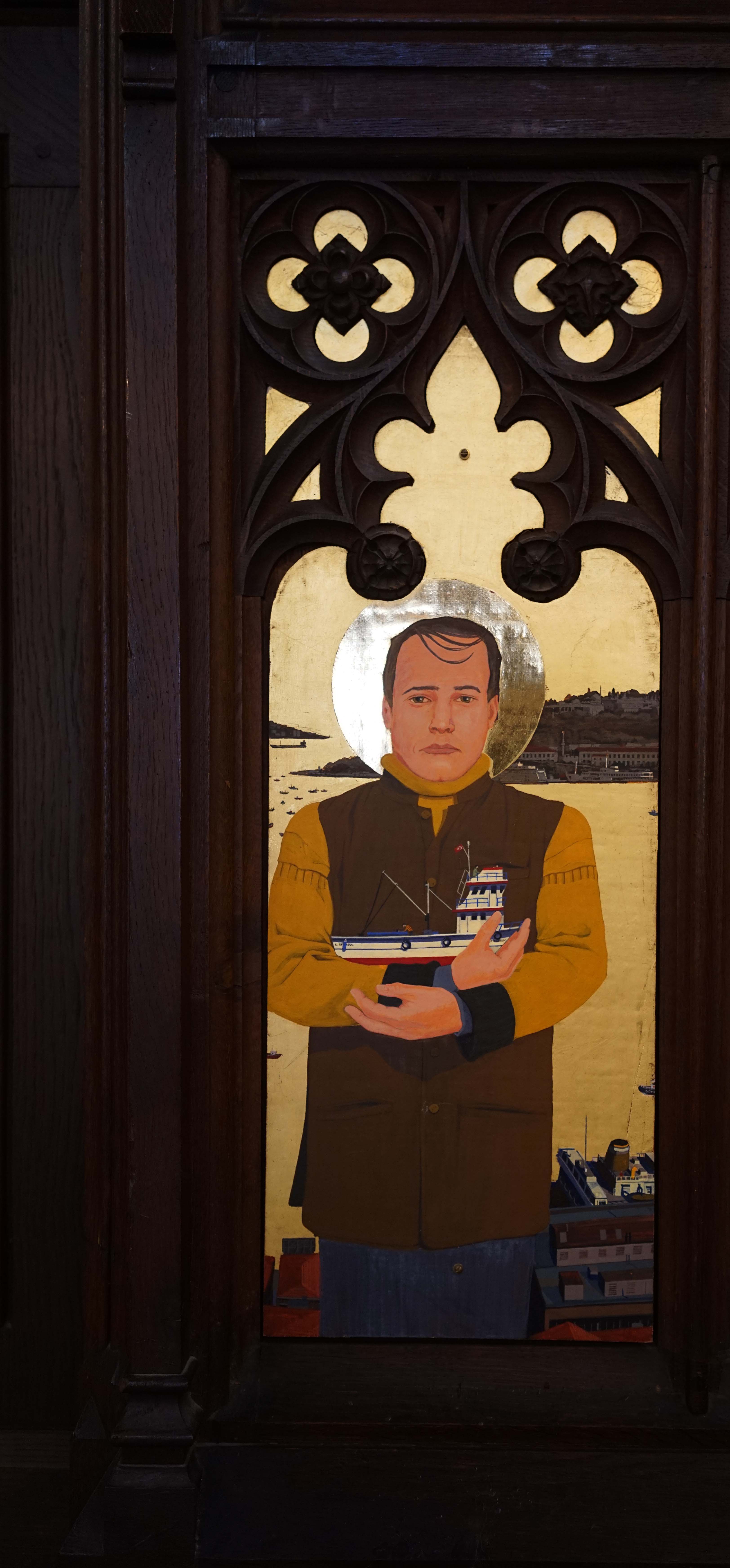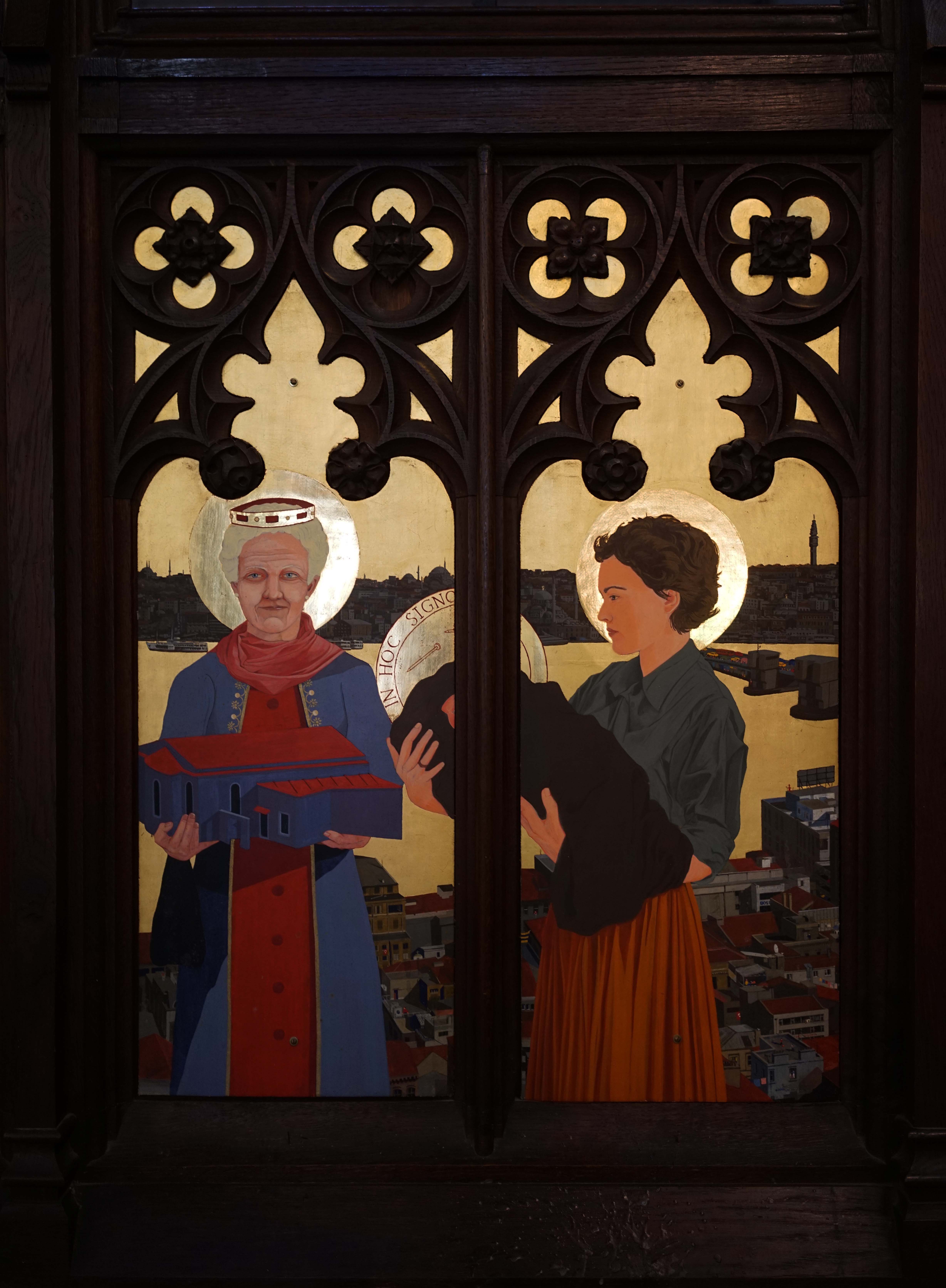 On Archbishop Ramsey’s robes you can see scenes of the Gospel such as the Nativity, the Crucifixion and the Resurrection. Pope John XXIII’s robe shows the saints of the British Isles: Saints George, Andrew, David (with his daffodil) and Patrick, patron saint of Ireland (who looks a bit like me, Ian, when it was painted). St Mungo is also there. In the background you have the heavenly city of Istanbul, in fact a view of Beyoğlu. The Galata Tower is on left, and near it is Christ Church and Saint Antoine’s Church, The Marmara Hotel in Taksim is on the far right.