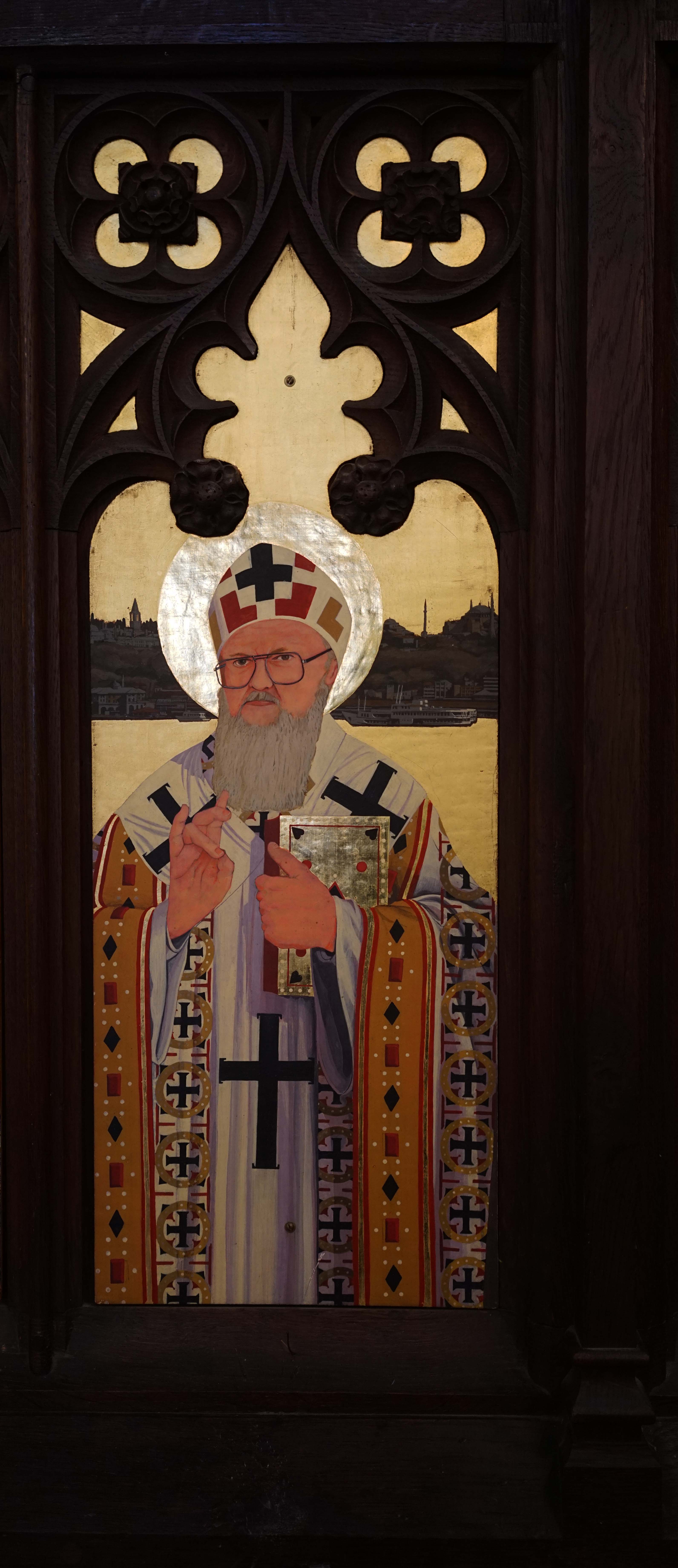 The current Ecumenical Patriach, Bartholomew, successor of St John Chrysostom, is shown as John Chrysostom in front of the old cathedral of Hagia Sophia.