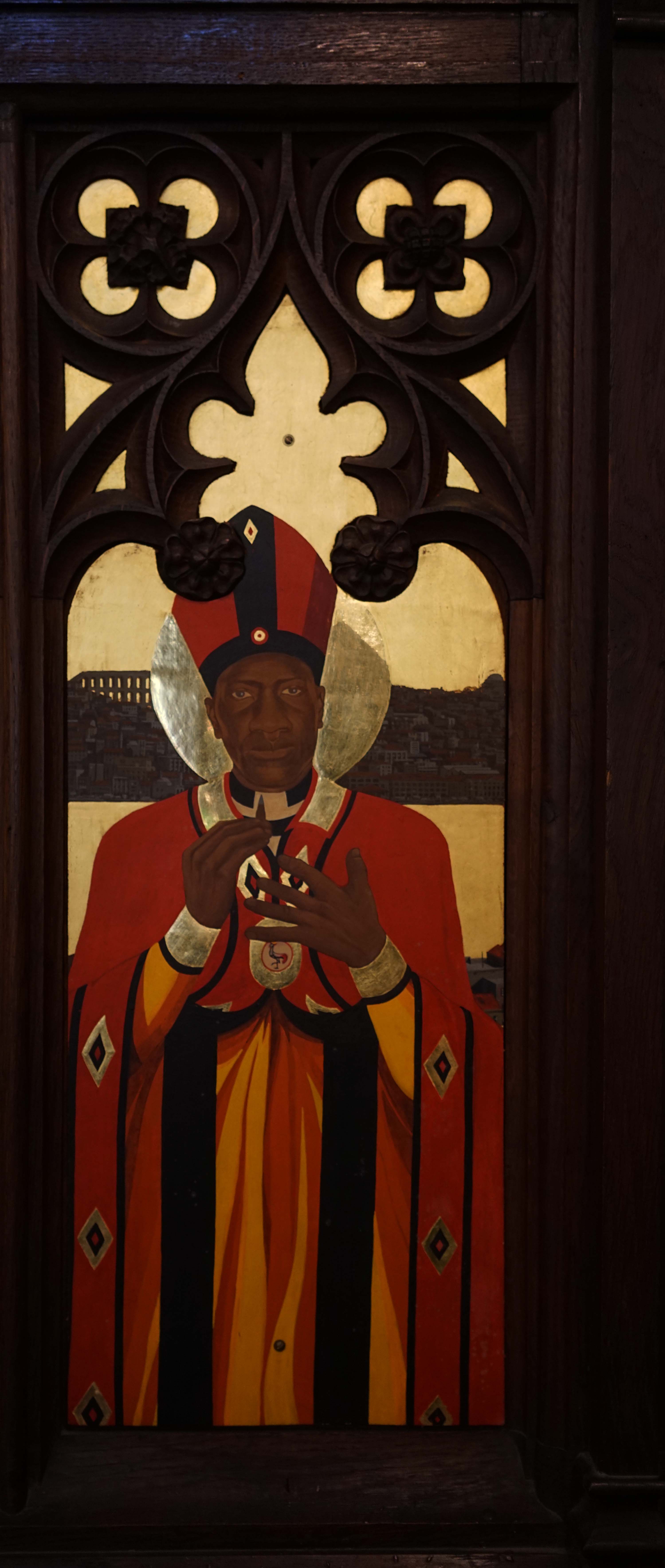 Paul Ouyemi, a Sudenese refugee who is now in Canada, thank God, Paul represents Janani Luwum, the famous archbishop in Uganda who was martyred under Idi Amin. Archbishop Luwum is holding a bullet. Traditionally in Christian iconography, martyred saints hold the means of their death.
