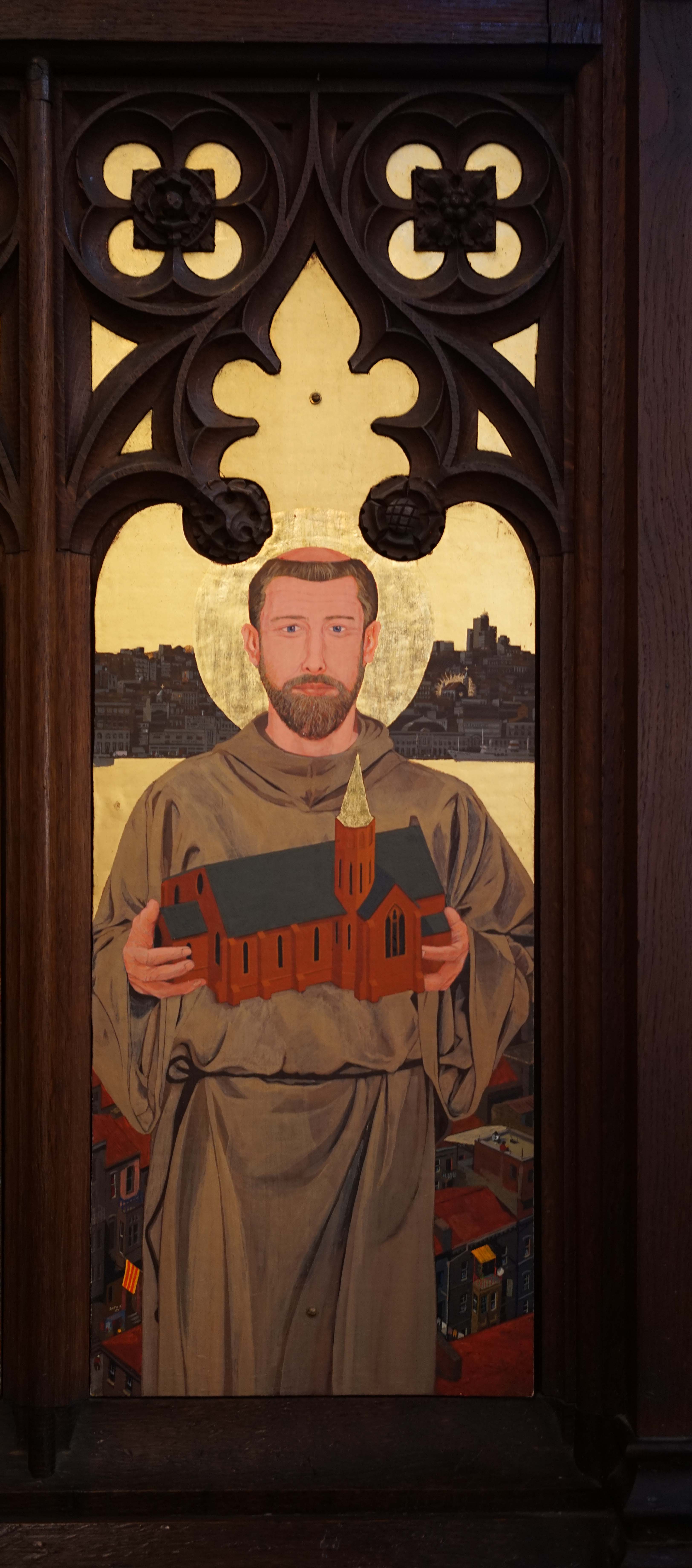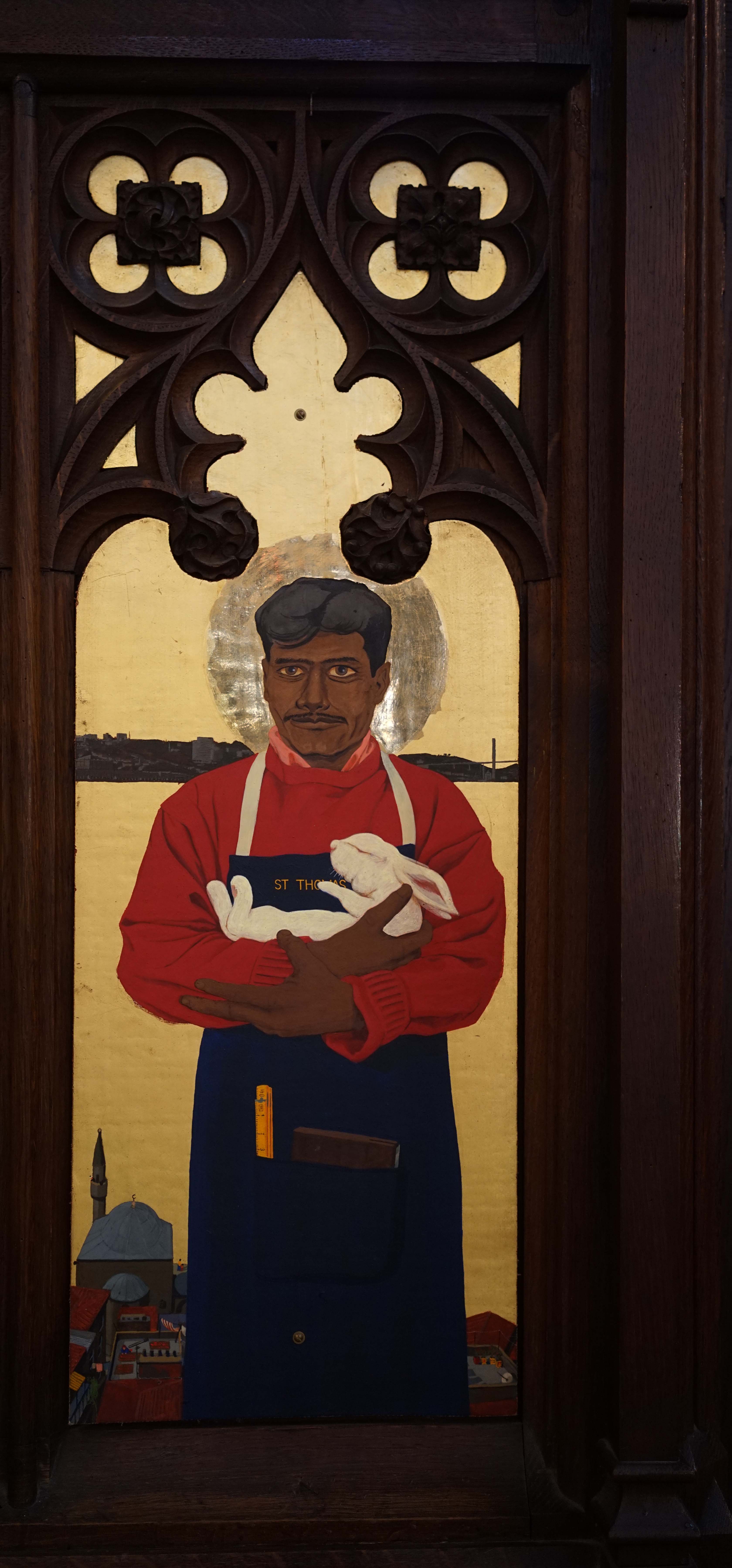 The face representing St Thomas of India is that of a Sri Lankan refugee who lived here for years. He used to love my pet rabbit, so he is portrayed with it. St Thomas is believed to have carried the gospel to India in the first century, where he founded the ancient Mar Thomist church.