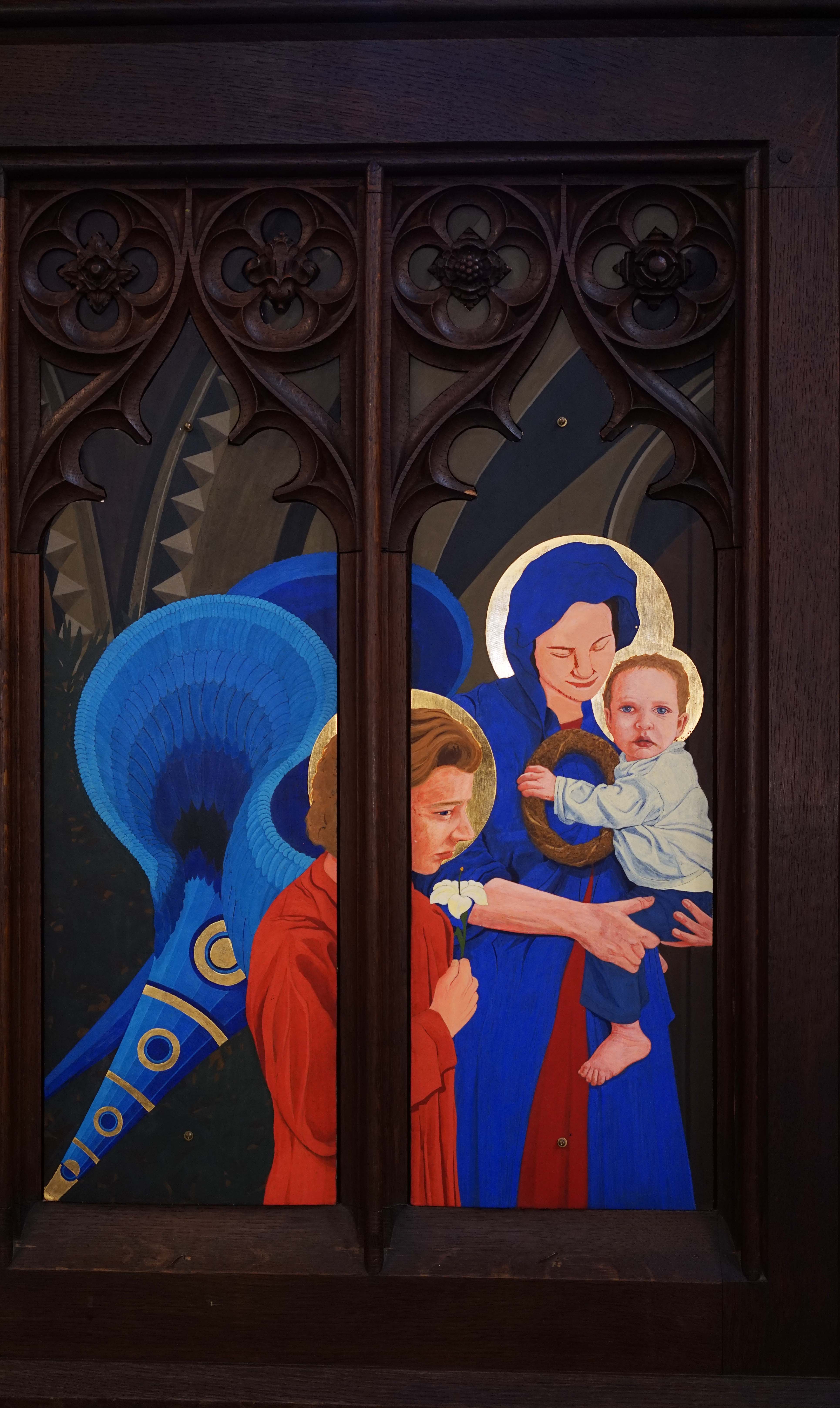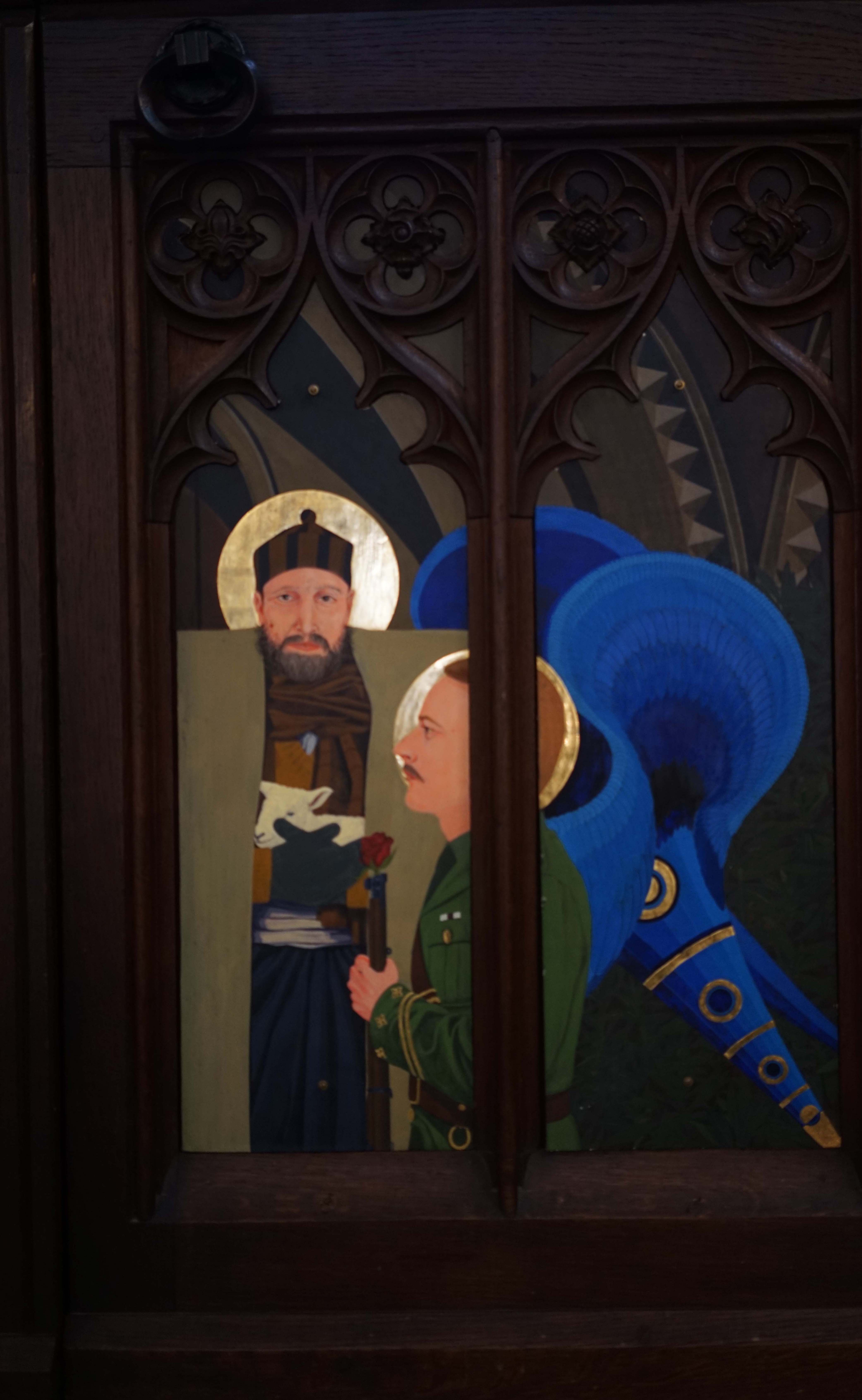 St John the Baptist is shown in one of those big, square Anatolian shepherd’s felt cloaks. You can see the doors of the porch of our church here symbolising the doors of Heaven replicated on these rood screen doors. St Michael the warrior Archangel is always shown in medieval pictures as a soldier, so Mungo has decided to show him as a Gallipoli soldier, whose face is in fact that of Mungo’s great uncle, with a rose rather than a bullet in his gun.