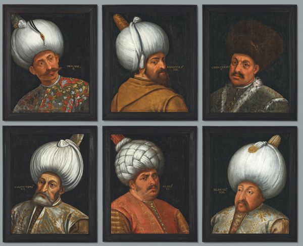 From a previously unknown series, oil on canvas, depicting Orhan (r.1326-1362), Bayezid I (r.1389-1402), Isa Celebi (1380-1406) , Mehmet I (r.1413-1421), Selim I (r.1512-1520) and Selim II (r.1566-1574), frame.