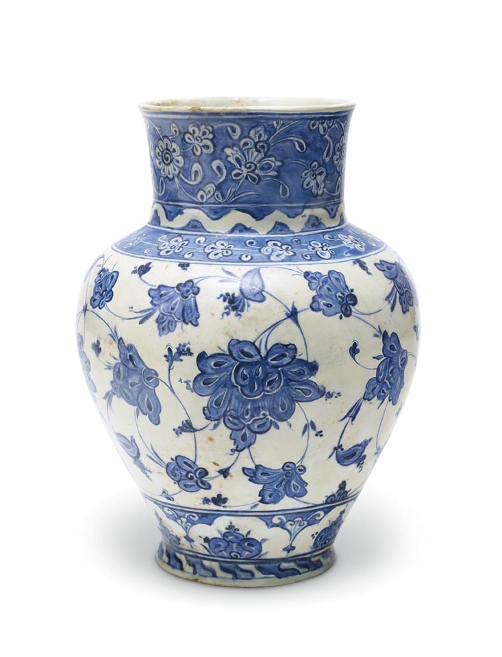 The white ground decorated in shades of blue with a band of meandering tendrils issuing complex floral terminals, a lobed band below, a meandering floral tendril on blue ground above, a similar band around the mouth, areas of restoration (est £100,000–£150,000)