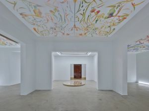The show opens in a room with a circular wooden form on the floor, adorned with cut-outs of vibrant, drifting geometric symbols displayed under glass. Furni uses these cut-outs as templates, spraying car paint through them to shape her paintings. The piece draws attention downward, inviting viewers to engage with the space in unexpected ways. The other three rooms feature ceiling-mounted canvases, each filled with reimagined animal silhouettes delicately infused with feminine motifs and illuminated from below. This work transforms the ceiling into an unconventional focal point, disrupting spatial norms.