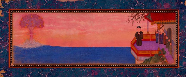 In the works of Murat Palta elements of popular culture, current developments, nightmarish mythologies, and Kim Jong-un overseeing a missile test all meet in the traditional style of old Ottoman miniature art. The combinations are both unique and humorous. The exhibition is named after a graphic that is based on microbiological experiences conducted on various bacteria and has been adapted to human life.