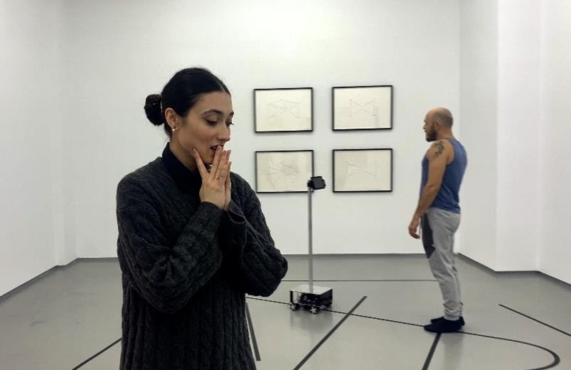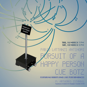 Pi Artworks Istanbul presents two unique performances as part of Fabio Lattanzi Antinori’s solo exhibition, Chased by Unicorns. Having created an international survey asking how we define ‘happiness’ in the present day, Antinori then created his ‘Bots,’ which traverse the gallery space, displaying a range of the survey answers on their screens. Responding both physically and emotionally to the Bot’s prompts, London-based performer Tommy Langdale and Istanbul-based opera singer Ezgi Aydin react to different notions of what constitutes a truly ‘happy’ person.