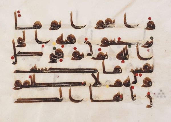 Lot 69: A Kufic Qur'an folio, Near East or North Africa, 9th/10th century, Qur'an II, sura al-baqara, Arabic manuscript on vellum, double-sided, with 6ll. of sepia Kufic, red, yellow and green dots marking vocalisation, folio 19 x 26.5cm. approx.