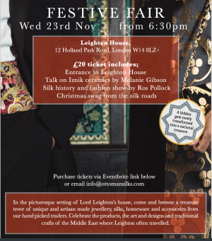 An evening of silks, ceramics and pre-Christmas shopping with a talk by Dr Melanie Gibson about Iznik tiles and a fashion show by Ros Pollock (Ottoman Silks) incorporating the new Glyndebourne collection. The talk and fashion show is ticketed and held in the studio but downstairs will be a few select stalls including Bethlehem Baubles!