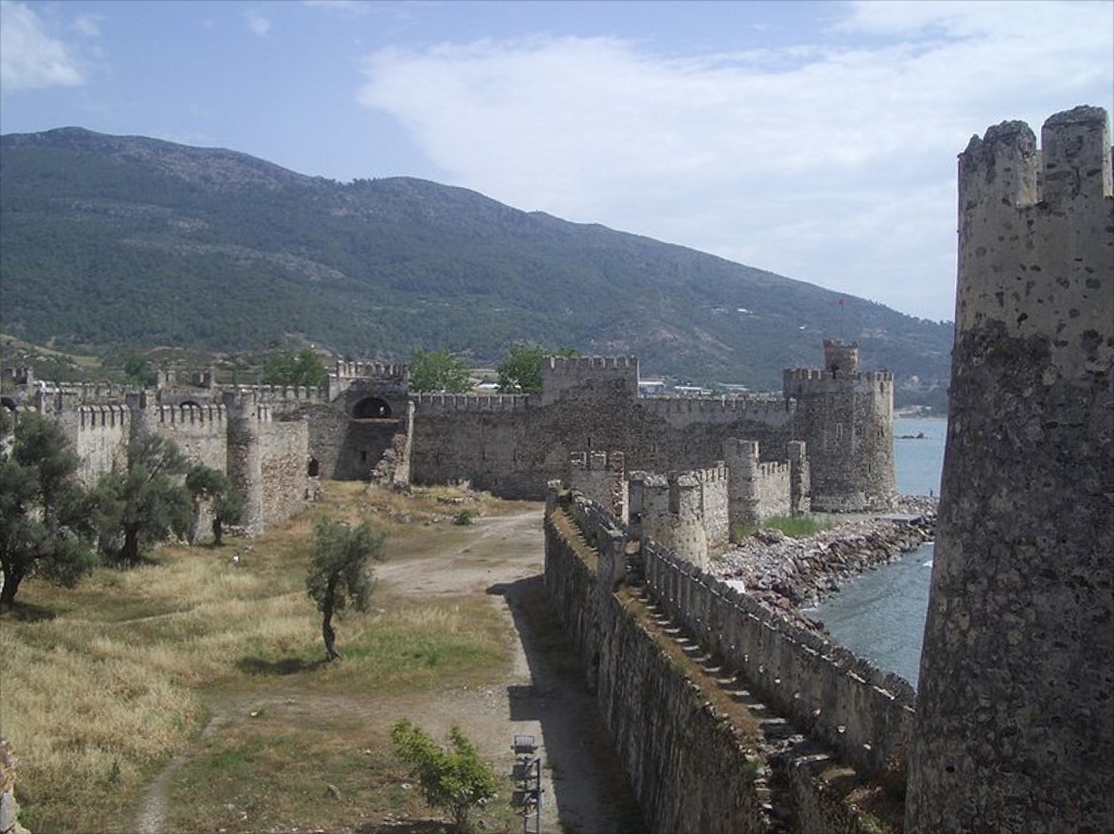On the east side is Mamure Castle, one of the finest in Turkey. A great bulwark by the sea surrounded by a moat, it resembles some of the "ancient castles of Great Britain," according to Francis Beaufort who surveyed the coast in 1812 (see Cornucopia 27). Dating from Roman times, Mamure served Byzantines, Crusaders and Ottomans, and was in use until 1921. Its 39 towers are intact. Expanded by the Karamanids in the 16th century with a mosque that is still in use, the castle is now a Unesco World Heritage Site.