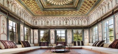 This is a really very fine Ottoman Konak from the early 19th century, now restored to an 18-room hotel. The best five rooms are on the first floor, all opening off a wide and very pretty pillared loggia overlooking the Konak’s three-sided courtyard. These rooms are nicely furnished with some good mid-19th century pieces (a bed from the Yildiz Palace, for instance, and some fine mirrors) and have lovely views south-west towards the mountains and towards Symi. The bathrooms are wittily disguised as cupboards. The best room was of course the Aga’s. His Başoda is now the sitting room of the hotel’s principal suite. It is difficult to convey what a charming room this is. A low, simply embroidered, white sedir runs on three sides. There are muraled views of Istanbul, probably by a local artist and painted perhaps from memory, or perhaps from the verbal description of the Aga himself. The painting is naïve, provincial and enchanting. The ceiling is intensely decorated, and at its centre is a wonderful painted medallion that seems to spin as you lie back on the cushions of the sedir and look at it. Their other 13 new rooms are in an annexe that looks onto the hotel garden. These rooms are comfortable and well done, but not in the same league as the rooms in the Konak itself. There is a small private hamam in the old part of the Konak which can be used by special arrangement.