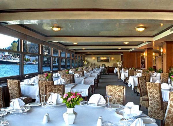 The dining room has a quiet dignity. The lighting is low and the design seems untouched by any notion of interior decoration after 1985. What this means is that there is no distraction from the wall of picture windows virtually level with the Bosphorus. As in an infinity pool, you might think you were in the sea (continues Andrew Finkel). For his full review, see Cornucopia 52.
