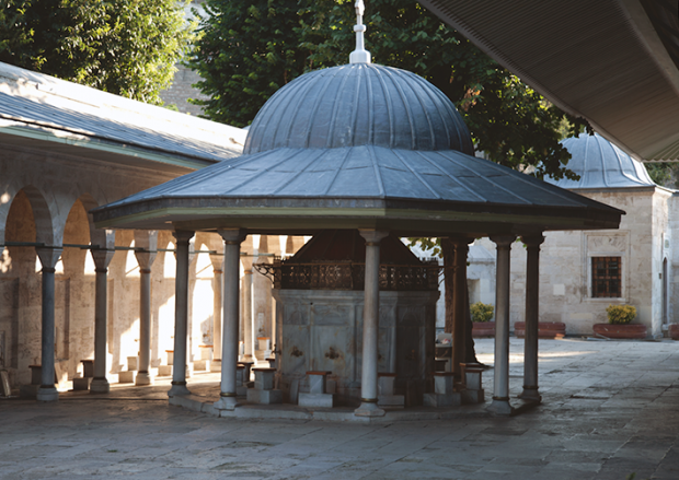 The mosque originally stood on the Bosphorus shoreline in full view of Topkapı Palace. The plan is a copy of Ayasofya’s, and it has the same calligraphic discs in the corners below the central dome. Kılıç Ali Pasha gained his epithet (kılıç means “sword”) by rescuing his squadron at the disastrous battle of Lepanto in 1571. He died a sprightly 90-year-old in the arms of a concubine (strictly against doctor’s orders). Like other Ottoman admirals, in winter he kept sailors employed building astonishing monuments. He oversaw the only surviving Sinan building in the Topkapı harem, Murad III’s domed bedchamber, which has tiles similar to those in the mosque.