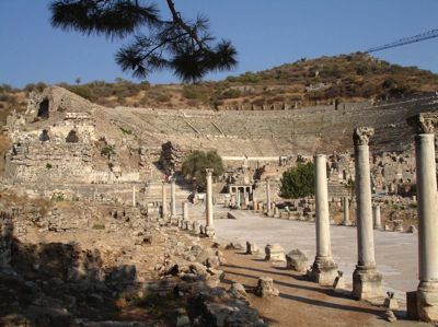 The identity of Ephesus was profoundly eastern. Antony and Cleopatra made it their capital during the Roman civil wars, and Plutarch tells us of Antony’s entrance into the city: “Women arrayed like Bacchus, and men and boys like satyrs and Pans, led the way before him, and the city was full of ivy and thyrsus wands and harps and pipes and flutes and the people hailing him as Dionysus, the giver of joy and beneficence.” Ephesus was one of the foremost ports in Asia Minor, and prominent Romans travelling east to take up governorships or administrative posts generally passed through; Pliny the Younger and Cicero both write in detail of their visits. From the end of the third century, however, the city began to lose its prominence as earthquakes brought down the great monuments and the harbour gradually silted up.