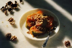 In the seventeenth century, Evliya Çelebi, the Ottoman traveller, praised the size of the pumpkins of Varna on the Black Sea: a single fruit could weigh up to 60kg. Today in the Balkans, the custom is to slice off the stem end of a ripe pumpkin, scoop out its seeds and pour honey into the cavity. The top is then replaced like a lid and the pumpkin baked in the oven.