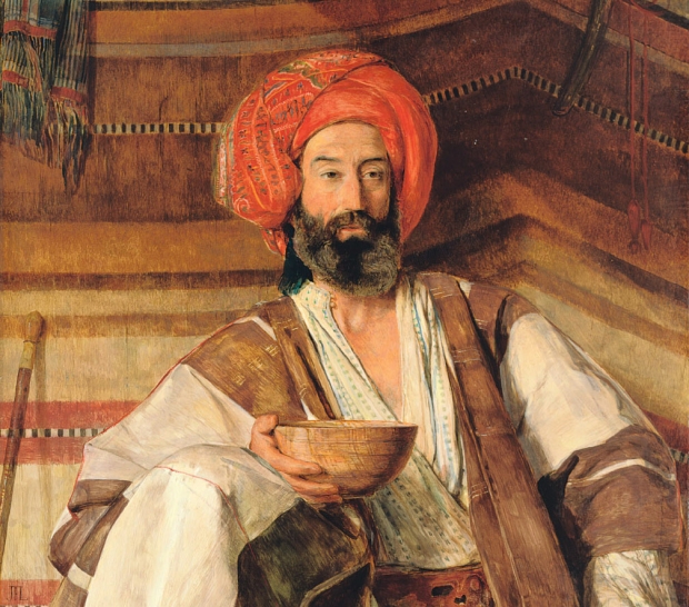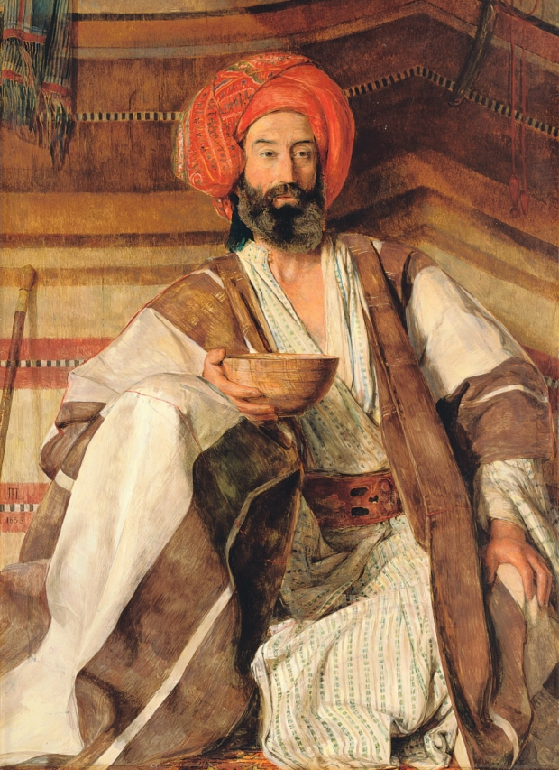 Running through the exhibition like a leitmotif are portraits of himself in different guises. An artistic chameleon, he changes colour and character to suit the environment in which he places himself. Whether in a rural Windsor landscape, a Scottish bothy or a Bedouin tent, he immerses himself in the subject matter by becoming a protagonist. These shifting identities are especially intriguing in a series of images that present Oriental figures that look as he did when he was living in Cairo – with a long face, large nose and a dark or greying bushy beard. The exhibition includes one of the earliest in this sequence: A Syrian Sheik, Egypt, 1856, apparently a Bedouin Arab from one region (Syria, to which Lewis did not go) displaced to another (Sinai, which he visited several times).