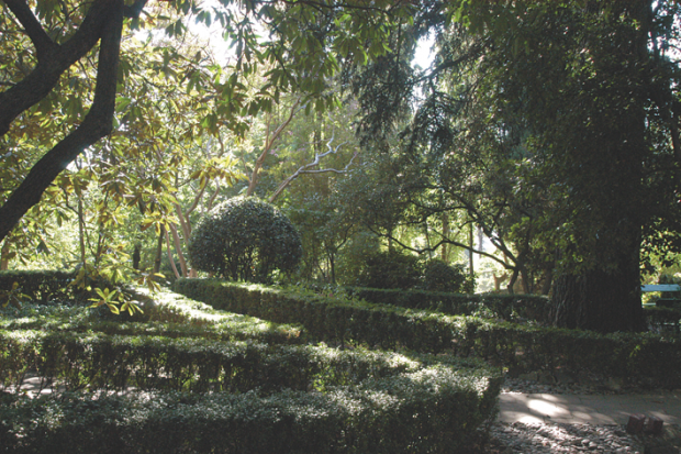 The house has a ground-floor veranda and a covered balcony on the first floor. A contemporary photograph shows that the trees he planted had not yet obscured the view in 1901. The garden, which he laid out himself, is made for pacing, with long winding paths edged with box.