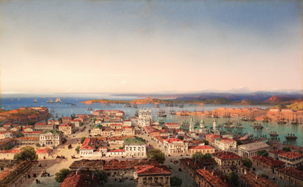 Sevastopol is a solid working city but with the look of a tiered wedding cake: a northern Neoclassicist’s version of a Mediterranean city, with sudden flourishes of Soviet heroism. Despite its formidable defences, visible here in Bossoli’s 1840s view of the port, it was twice flattened by European bombardment – French and British in 1856, German in 1942. After each horrific siege, it rose again, but in the 1950s, as thousands of labourers from all over the Soviet Union finished rebuilding it to Stalin’s taste, it vanished for almost five decades into a Cold War fog, a “closed city” seen only by the Soviet navy (and no doubt spies) until 1997. It is still home to the Black Sea fleets of Ukraine and Russia.