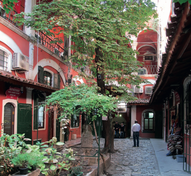Istanbul’s Grand Bazaar is a covered box (“kapalıçarşı kapalı kutu”), the poet Orhan Veli said. Lift the lid and all manner of goodies come tumbling out: colourful, joyful, decorative. As you enter, no matter who you are, a childlike mood comes over you. Everyone can find some reward among the endless jewels, bolts of cloth, silken scarves, pashmina throws, merchandise from every corner of the world. It helps, though, to have an eye, to sort the elegant from the trash and kitsch, the belly dancers’ costumes, football shirts and Lacoste knockoffs. Here is a rainbow of Iznik tiles, collectable and decorative; there, glittering lanterns. Stacked alongside the latest offerings from Gucci, Armani and Chanel are handmade leather Yemeni slippers. Leather is everywhere – in smart shoes, jackets, handbags, briefcases, belts – and the quality seems to grow ever better, but it takes confidence to spot the wearable. Interesting leather shops crowd in on the old Havuzlu Lokantası, the Restaurant with the Pool. There are inlaid backgammon boards, onyx chess sets, strings of pearls, meerschaum – some items traditional, others new. At either end of the Grand Bazaar (also known as the Covered Bazaar), fortress-like gates lead into the main street, a barrel-vaulted treasure trove glittering with goldsmiths’ shops, that extends all the way from the Beyazıt Gate in the west, next to the shady book bazaar, to the Nuruosmaniye Gate in the east, with its colossal Baroque mosque. Off to the north, streets branch down the hill towards Eminönü, in a labyrinth of specialist quarters, of carpets, silver, fabrics… Clusters of han courtyards extend well beyond the bazaar confines, full of curious architectural detail and wonderful to explore. Together they become a maze, built up layer upon layer over the centuries as shops, workshops and entire trades were added. In a city where so much is changing, it is a relief to find old friends still prospering in this enduring place…