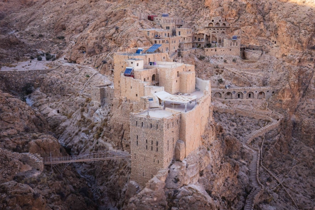 Deir Mar Musa al-Habashi perches among the limestone hills halfway between Damascus and Homs. From the upstairs terrace of the monastery you can see the great wastes of the Syrian Desert, where the Hejaz railway once ran, connecting Istanbul to the holy cities of Mecca and Medina. Although now there is talk of rebuilding the railway, it is unlikely to disturb the monastery’s quiet isolation. The climb to Mar Musa is steep, with narrow, winding stairs built into the rock. As we slowly ascend, the monastery’s inhabitants peer down at us from the terraces. Before becoming a monastery this was a Roman fort, built in the 2nd century to guard the desert road from Damascus to Palmyra.