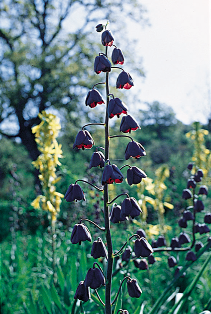 But our most exciting find here was a small graveyard by the wayside filled with hundreds of Fritillaria persica in full flower, a tall, black-flowered form close to the garden variety called adiyaman, which presumably originated near the town of that name much further east. Hundreds of stems around five feet tall were growing with yellow Asphodel, Asphodeline lutea. This is the westernmost area in which this fritillary has been seen, but it grows as far east as the Zagros Mountains in Iran, and in a slightly different form as far south as Petra in Jordan. It is not only to be found in this graveyard, as we saw it in several other places in the same area, though never in such beauty or profusion. Was it originally brought here from the east and planted in some Ottoman garden? We can never know. We do know, however, that it was grown in Istanbul in the mid-sixteenth century, and from there was taken with other bulbs to Holland.