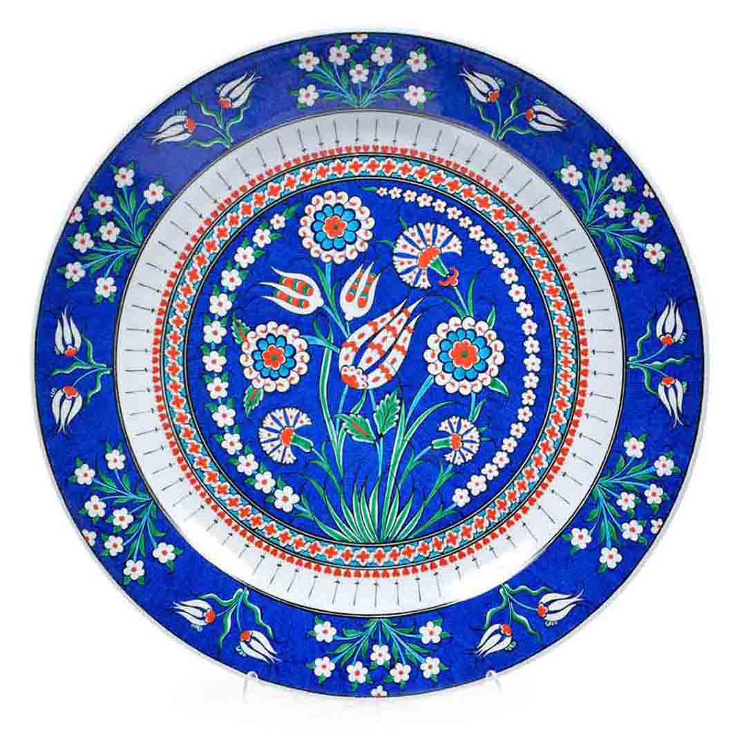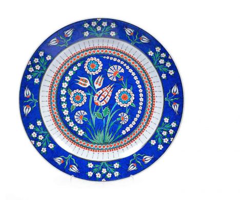 An Iznik plate with flowering plant and tulip design, V&A Museum, 43cm diameter. It comes from the kilns of the UNESCO-award-winning master Mehmet Gürsoy. The high quartz content is what gives the colours their brilliance.