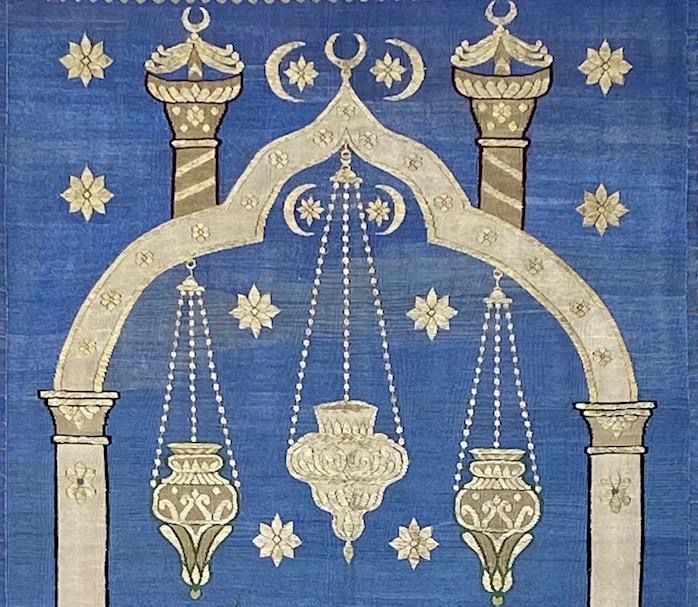 One of the exhibits at the Museum of Turkish and Islamic Art: Prayer Rug wall-hanging (‘SAJJADA LIL-ZAINA’) circa 1870, Zouk Mikael (Lebanon Mountain), Ottoman Lebanon. Tapestry flatweave. Woven in silk, gold and silver metallic thread on a cotton foundation.