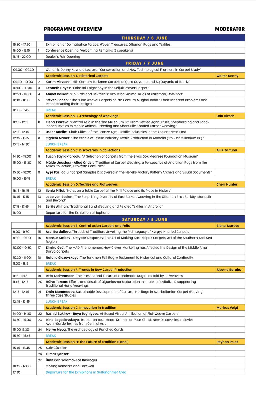 After a short break, Alberto Boralevi introduces Trends in New Carpet Production, and after lunch a series titled Innovation in Tradition is moderated by Markus Voight. Sessions end with a panel on The Future of Tradition, moderated by Reyhan Polat.
