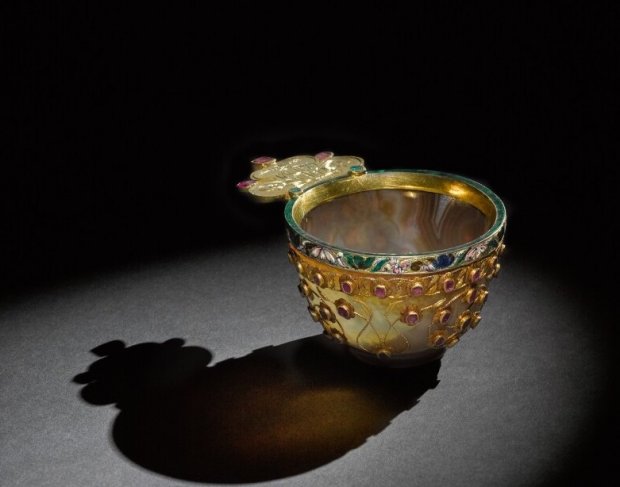 The Russian court was full of Ottoman treasures. Catherine the Great's crowned cipher the year 1789 have been added on top of the handle of this splendid agate Ottoman cup, set with rubies and emeralds (Sotheby's Lot 168). The Empress had annexed Crimea for the Russians six years later, and arrived there in a magnificent procession to take up residence in Bahçesaray, the palace of the conquered khans. The court is out as to whether the enammeled gold mount is Russian or even French. The estimate is a modest £80,000–120,000. The experts say it has a wonderful tactile feel and weight to it.