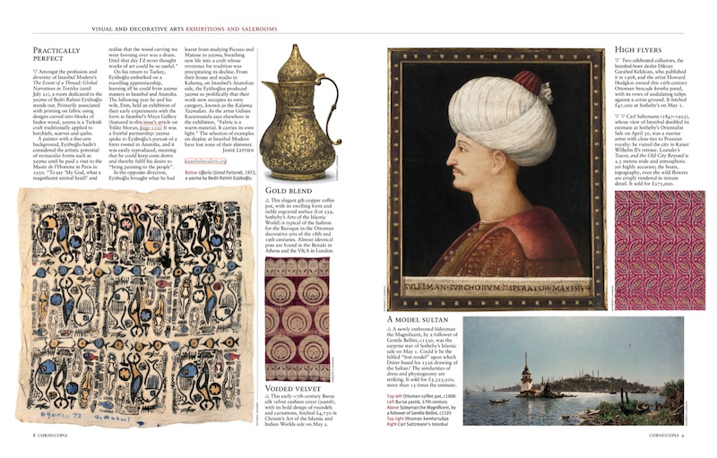 The latest issue of Cornucopia, No 59, is just out, and it marks the start of a new phase for the magazine, as it goes online. From now on, all issues will be available for subscribers to scroll through the elegant pages not just of the latest issues, but back numbers too, making it a terrific searchable resource for all matters cultural in Turkey, past and present. Of course the beautiful print editions will continue to come off the presses to become valuable collectors’ items.