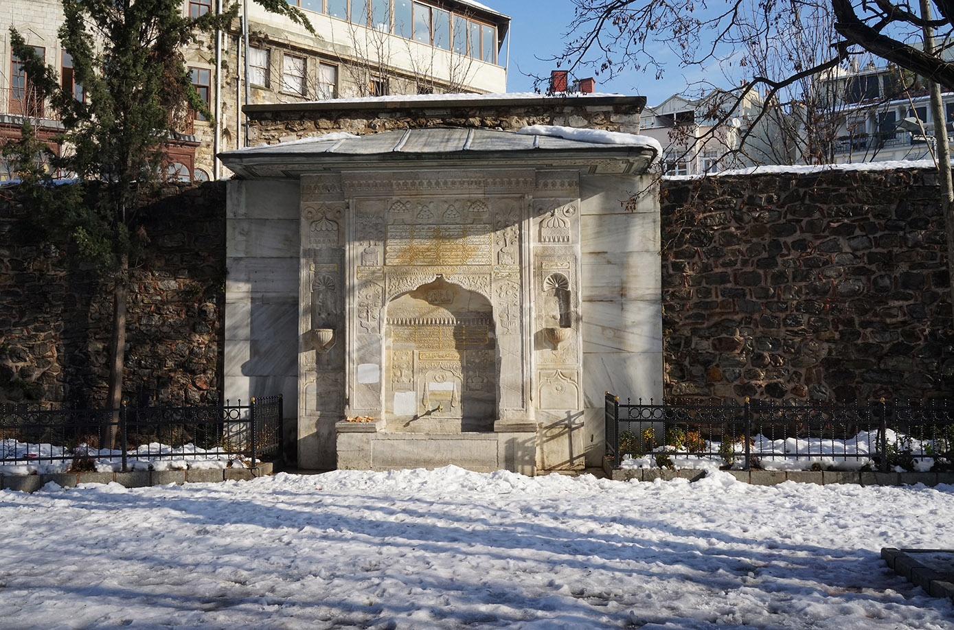 Winter light on the Bereketzade Fountain in front of Galata Tower.
