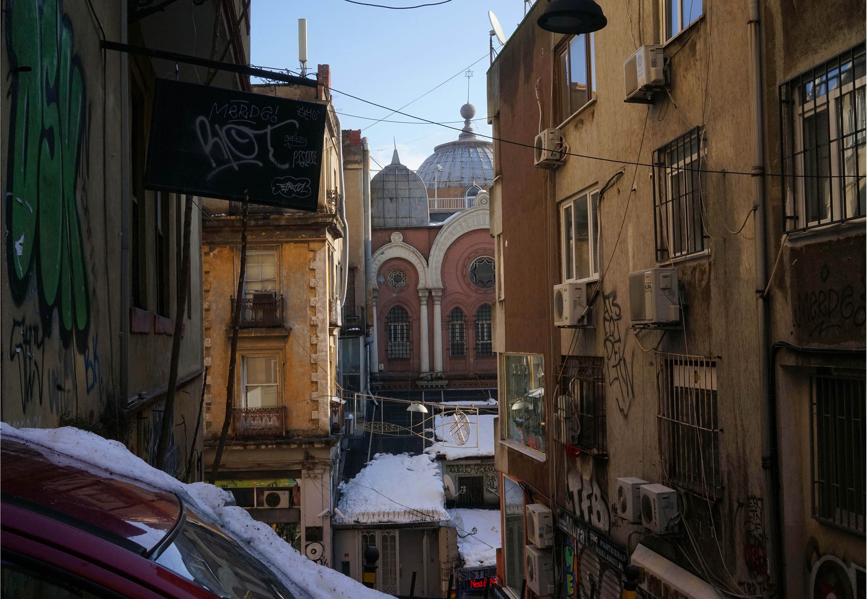 The Ashkenazi Synagogue seen through the back streets of Galata.