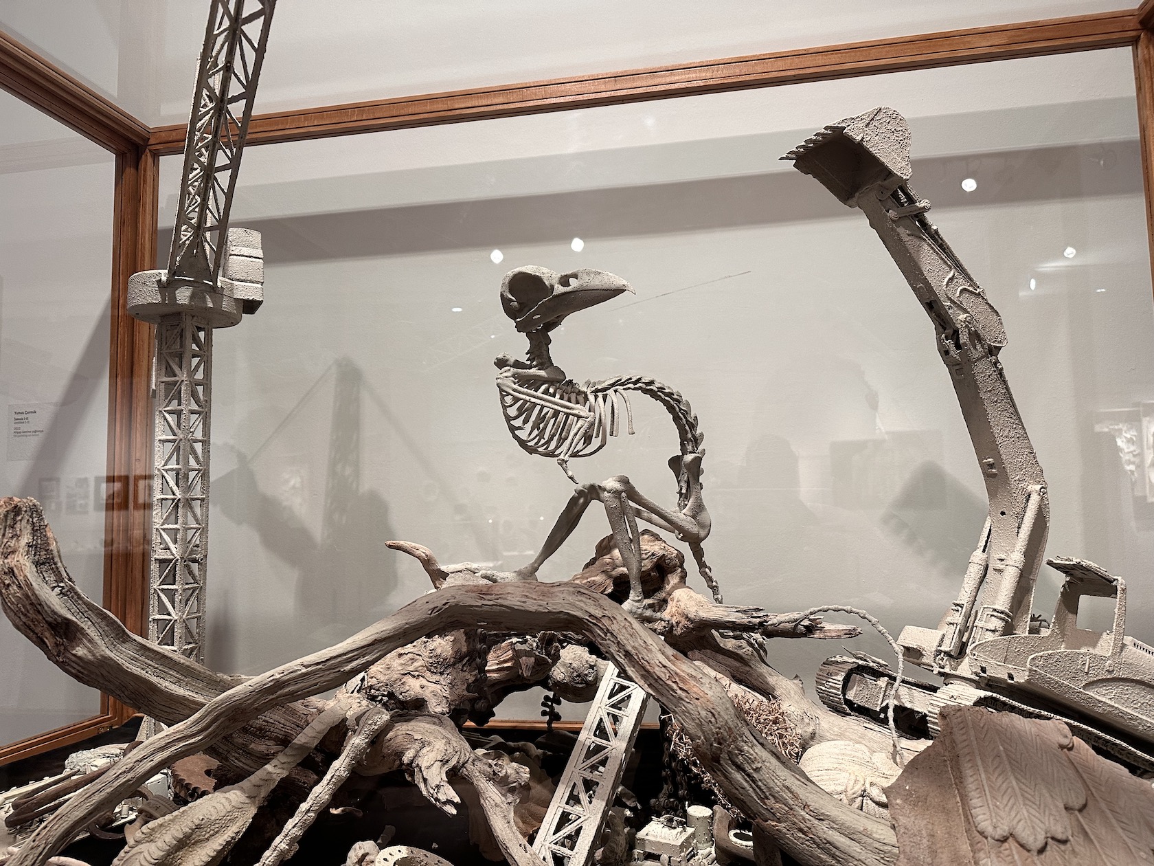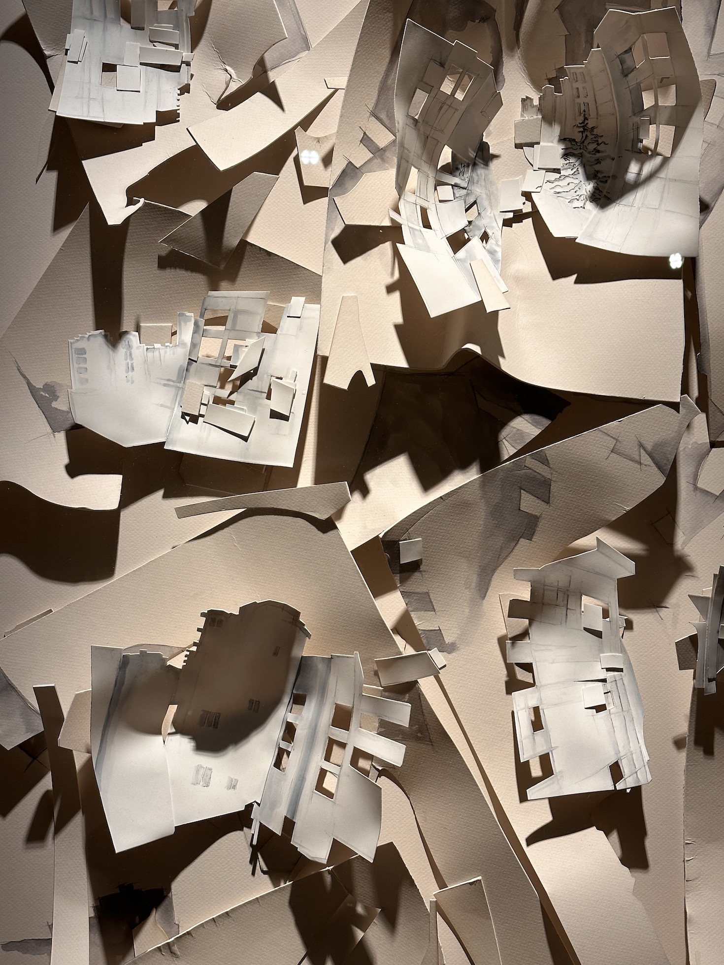 Dystopian cityscapes are a common theme, as voracious cities are depicted as ever-expanding and ever-consuming. Crumbling buildings, infinite infrastructure, and an incompatible past and present greet the viewer. Güneş Çınar’s When All Colors Fade (2018) depicts a lone skeletal bird sitting atop an ongoing build, with tree branches weaving among the rubble. In turn, Esra Carus’ Here We Are (2023) presents warped fragments of paper buildings that seem to have no distinct form or identity.