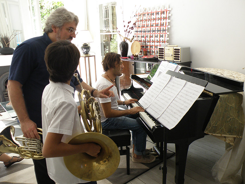 İnci Coşkuner hosts the masterclasses with her architect daughter, Elif Pekin, in the family's romantic stone house in the heart of old Urla, a distinguished 19th-century merchant's house built by one Kosto Efendi, which they have painstakingly restored. İnci Hanım wrote today to tell us how the days unfold. Each morning the distinguished professor leads his gifted young horn-players through a series of physical warming-up excercises, pausing to inspire them with practical, always positive words of advice on how a real artist must attain complete musical wholeness.