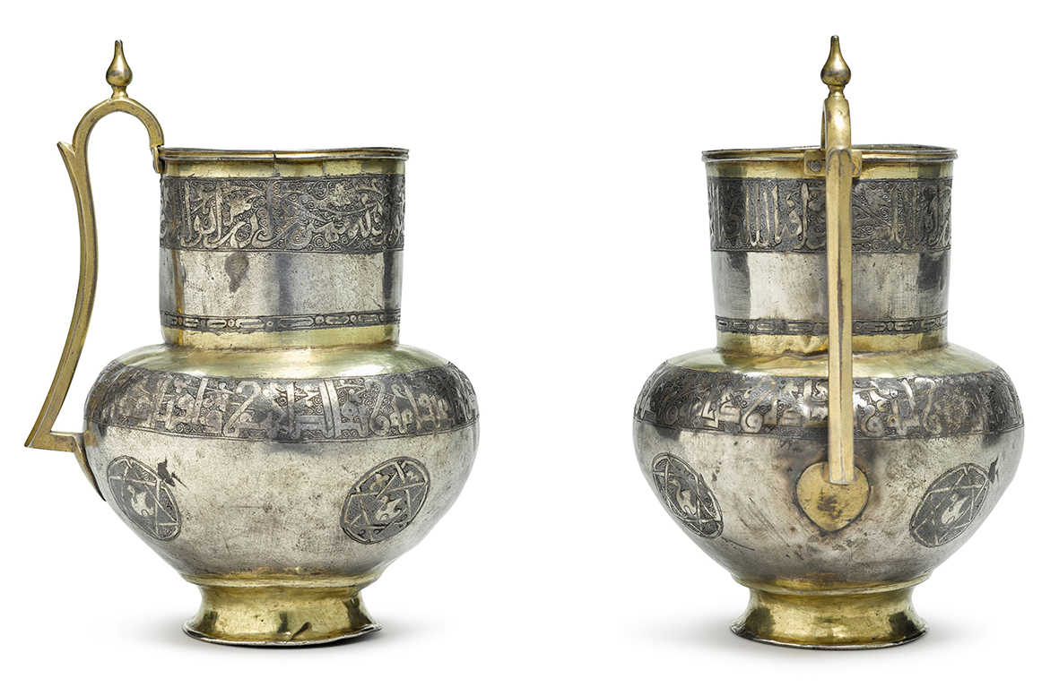 Two views of Lot 169 in the Islamic World sale on October 27, a rare and important Seljuq silver-gilt and nielloed handled jug, Siberia or Central Asia, 11th/12th century (est £80,000–120,000)