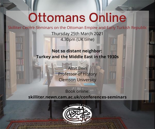 Ottomans Online is a series of seminars on the Ottoman Empire and Early Turkish Republic hosted by the Skilliter Centre at Cambridge University. Amit Bein is Professor of History at Clemson University, and the author of Kemalist Turkey and the Middle East: International Relations in the Interwar Period (Cambridge University Press, 2017) – he takes the line that Turkey in the 20th century was much more entangled with Middle East affairs than historians generally project.