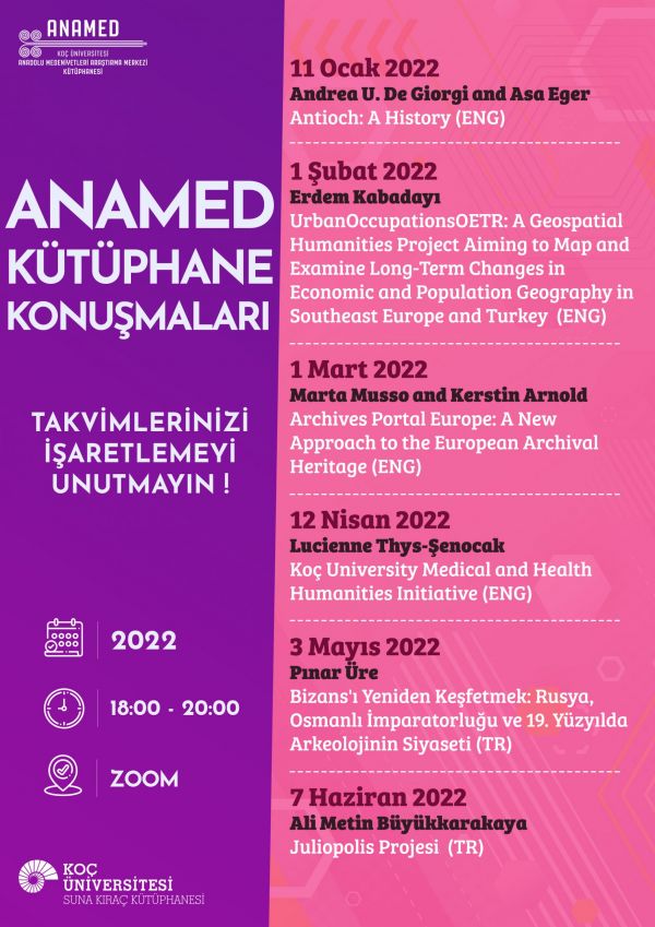 The ANAMED Library Talks series continues in 2022. The program for spring 2022 includes a wide variety of topics from distinguished scholars from Turkey and abroad. All talks will take place from 18.00 to 20.00 Istanbul time. Please see the