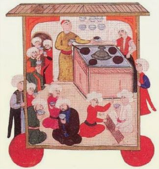 Although coffee was already widely consumed in the Ottoman Empire, it was not until the 16th century that it was served and sold in places specifically dedicated to the beverage. In 1544, two Arab entrepreneurs opened establishments beside the Golden Horn, in the district of Tahtakale (still the home of Kurukahveci Mehmed Efendi, Turkey’s most famous coffee producer). In an area notorious for its taverns, they began to sell coffee instead of wine. In a very short time, coffeehouses became Istanbul’s favourite secular meeting places. Games such as backgammon and chess may have been popular there, and books and poems were recited, but the coffeehouse was primarily a place for conversation. Merchants ensured that the fashion quickly spread across the empire and eventually to Europe.