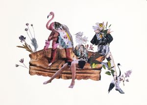Happy at Nowhere, by Ekin Su Koç, delve into themes of migration and a sense of belonging. Her works use fabric materials and techniques such as collage on paper and paint on canvas. Using details like fish bones, Ottoman fabrics, maps, black and white photos from old immigrant houses, lace, and images and pieces of different hair, she explores the disorientation of movement.