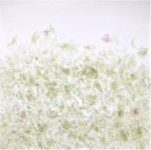 The Beyoğlu gallery Öktem Aykut (founded by Doğa Öktem and Tankut Aykut is showing the beautiful canvases of Murat Yıldız in Art Fair Basel, highly sensitive work not simply inspired by the transient world of fading flowers and fallen leaves but actually created with them as well. Illustrated here is Pool of Flowers, in which fresh flowers and leaves are rubbed onto the canvas. Below is one of the most recent, in which colour pencil has been used added to the natural pigment released by the flowers and foliage.