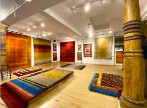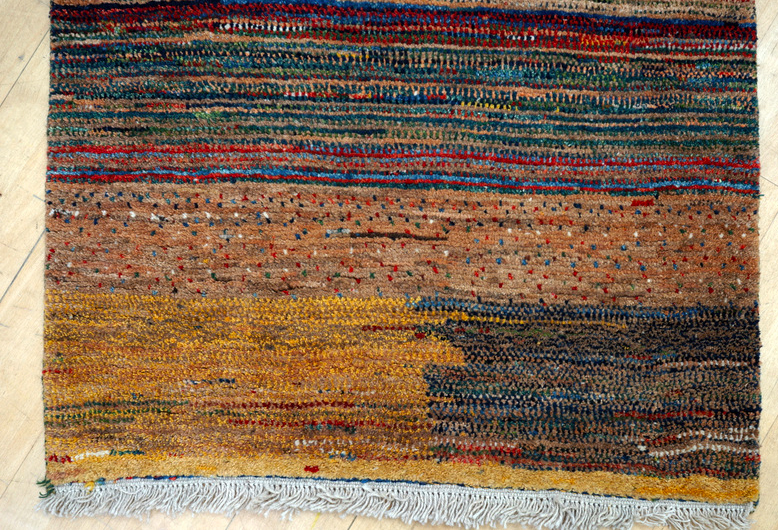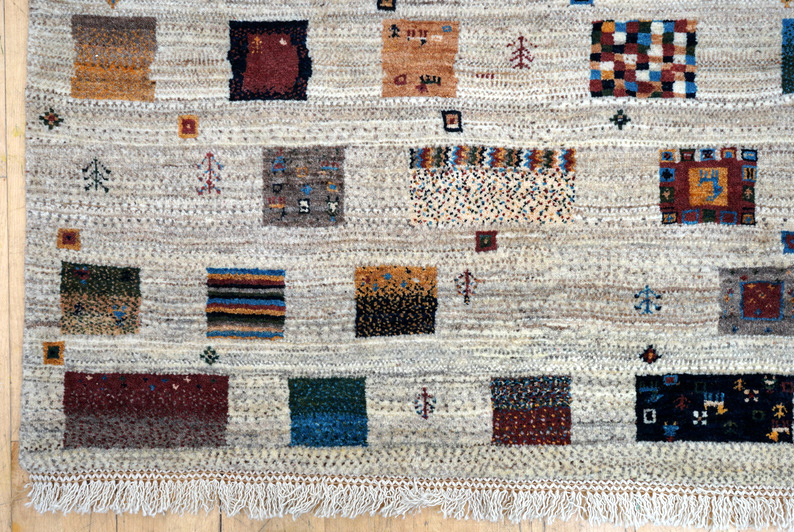 Gabbeh rugs were originally used for sleeping on by nomadic shepherds of South-West Iran. They were traditionally plain, often one colour with a few simple figures of people or animals. In Nomads Tent’s selling exhibition of new handwoven Gabbeh rugs, nomadic simplicity compliments the mood of contemporary interiors.